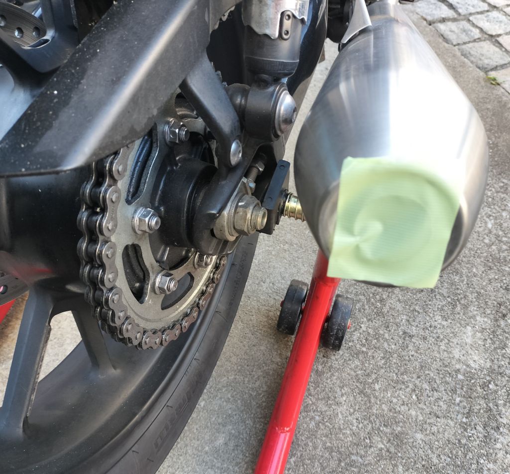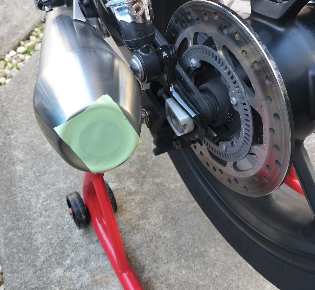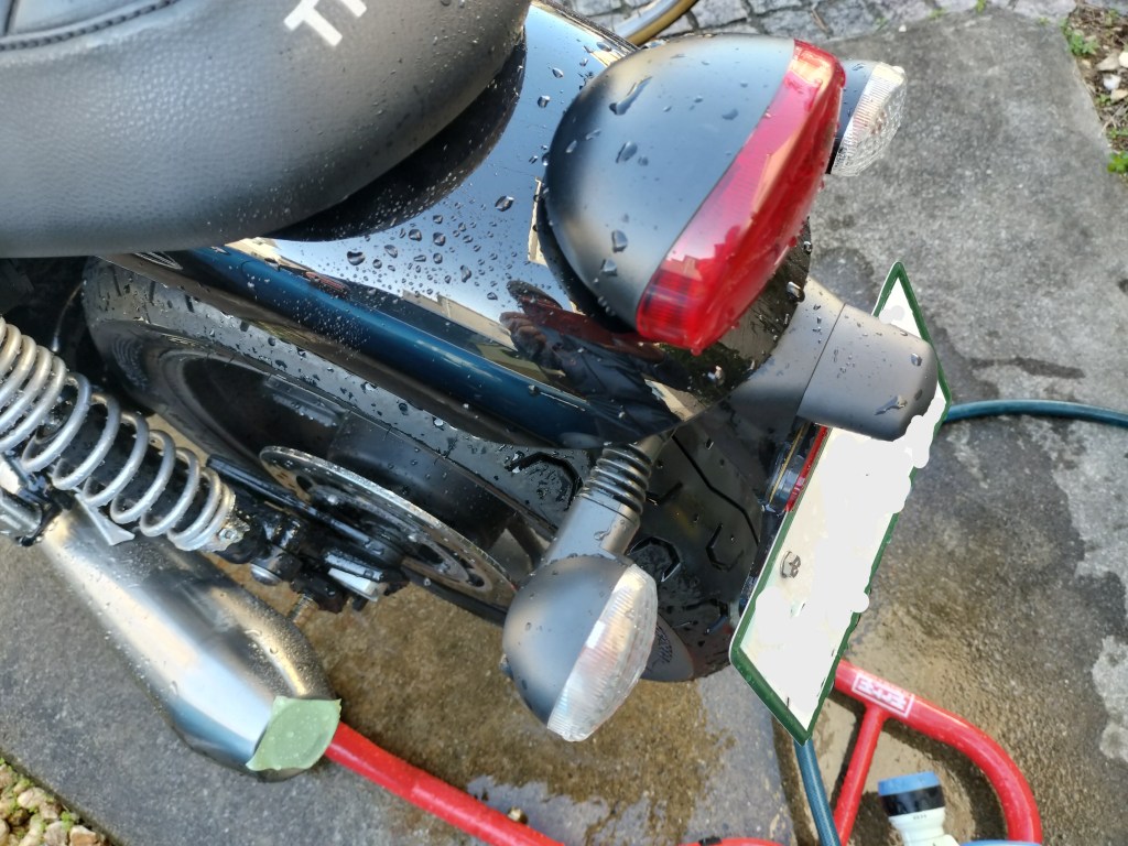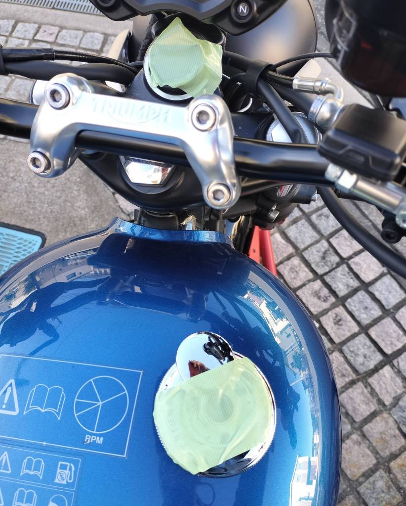 Street TwinのODOMETERが9,000㎞に近くなってきたので、久しぶりに洗車することにしました。転倒でつけてしまった傷を補修するためでもあります。洗車の手順はいつもと変わりません。鍵穴とマフラーを養生することから始めます。