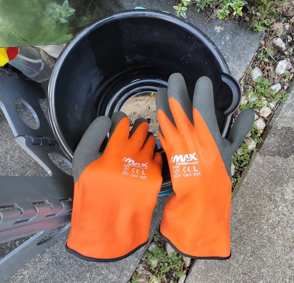 次に水洗いです。本当は水を流しながら素手で車体の大きな汚れを落とすのがよいのですが、冬場で水が冷たいので、防水手袋を使用して作業を行いました。さすがワークマンの防水手袋です。冷たさを感じません。中のフェルトのような生地のせいもあってか、暖かい感じさえします。素晴らしい。