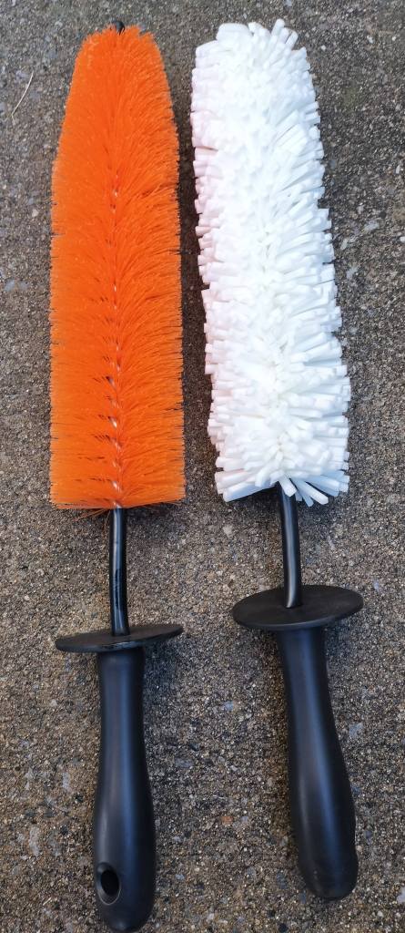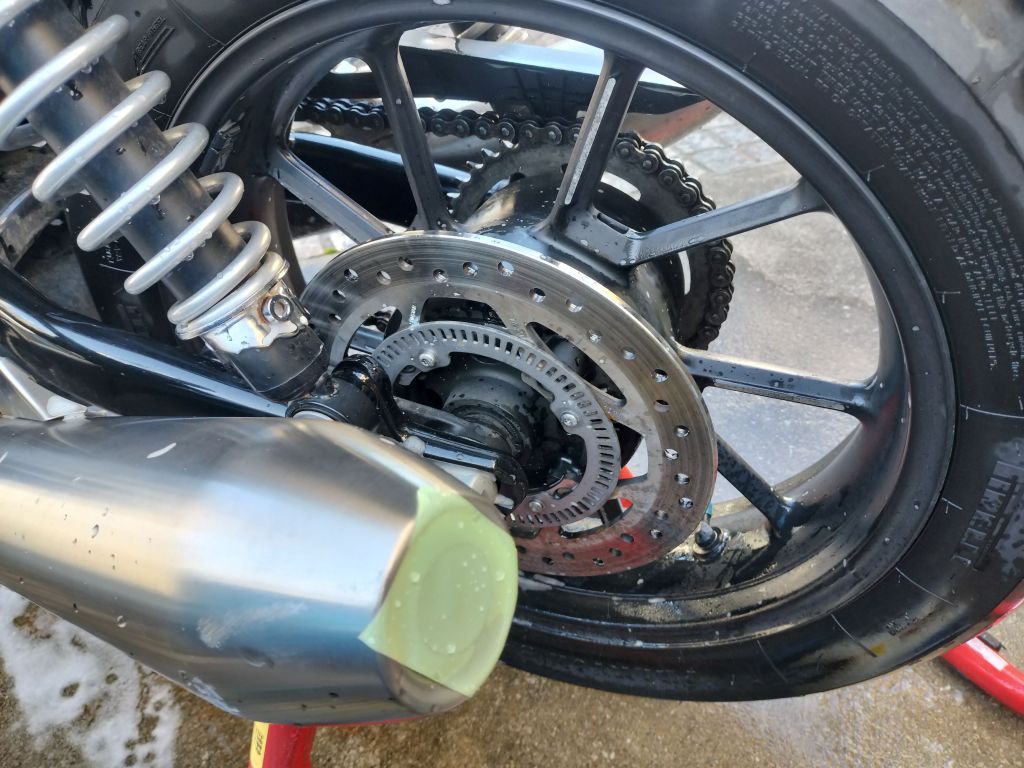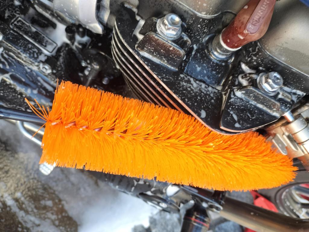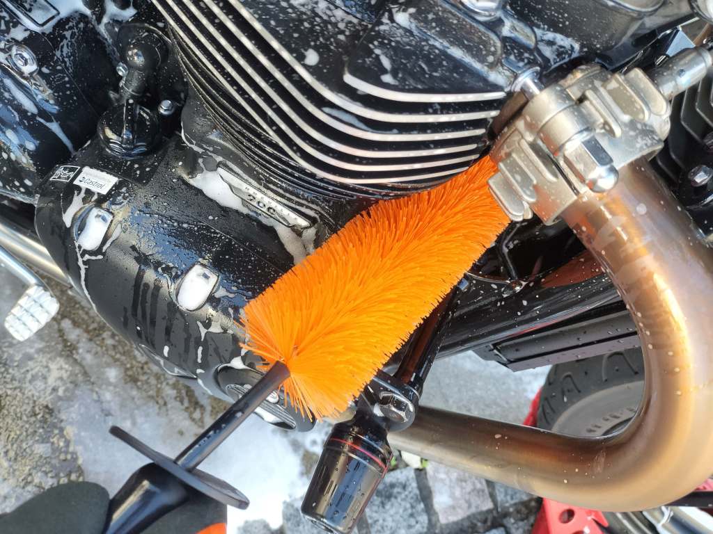 バイク用シャンプーで車体を洗います。今回はフレキシブルブラシをエンジン、ホイールの清掃に使用しました。オレンジ色のブラシでエンジン周辺の汚れを落とします。ブラシの毛が樹脂製なので、あまり強く擦らず、軽く当てるようにしました。白いブラシでホイールの汚れを落とします。こちらはスポンジのようなブラシです。容易に曲げることができるので、ホイールの曲線に合せたり、手首が楽な角度に曲げたりしながら使用しました。一般的な四角いスポンジも併用しているのですが、手の入りにくいところの作業が楽に思います。