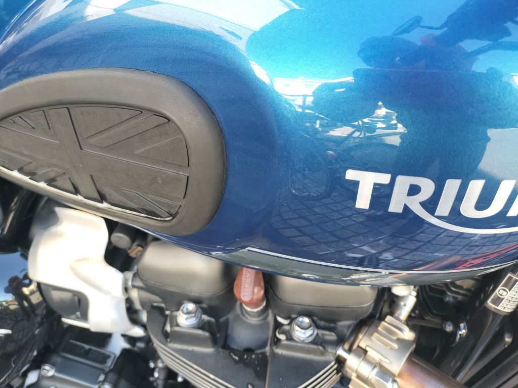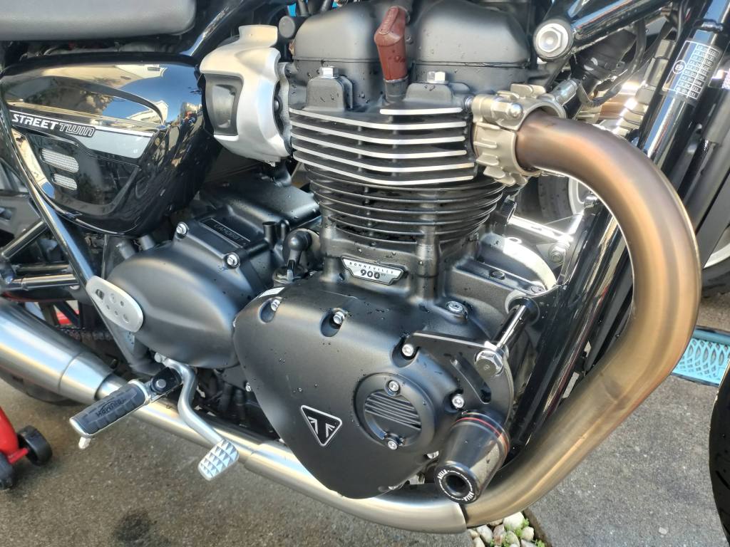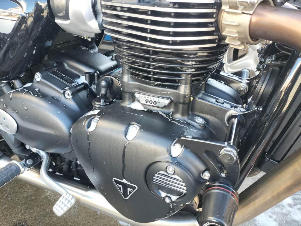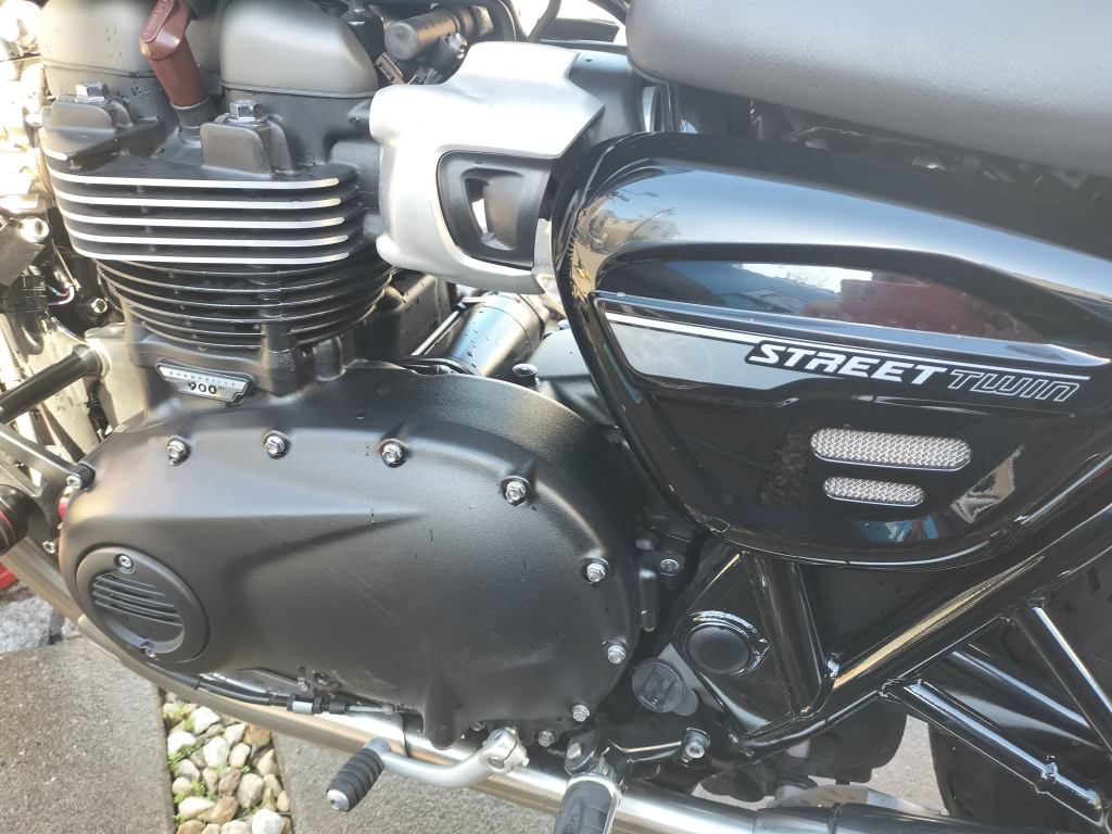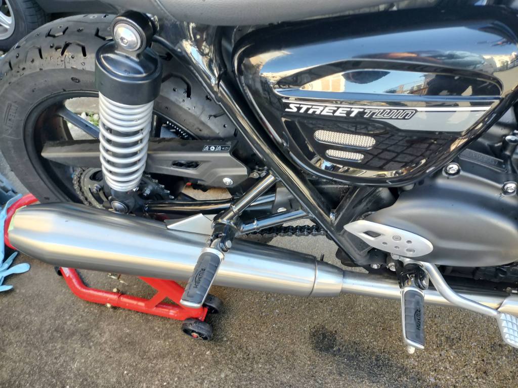 シャンプーを水で洗い流し、水滴を拭き取ります。拭き取りにくい水滴は、エアダスター缶のエアーで飛ばします。乾いたタオルで丁寧に拭き取り、Street Twinが再びキレイになりました。キレイにすると気持ちいいです。