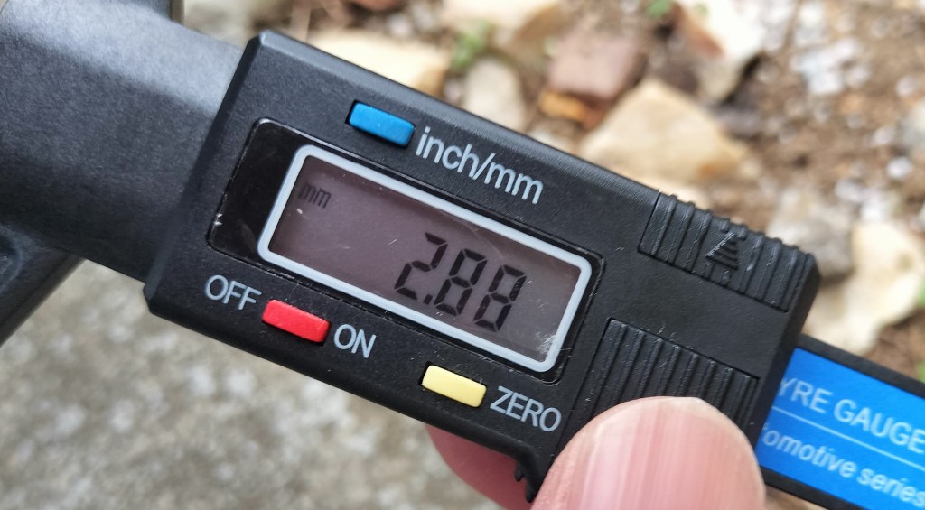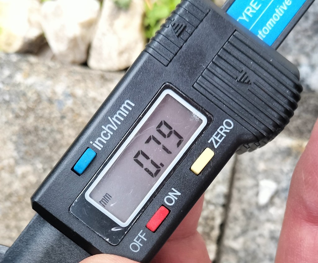 後輪を測ると、溝が減っているようです。今回はきちんと測ることができたのでは…と思います。前回と前々回の数値は参考程度の精度と思います。前輪と同じく、Depth Gaugeの私の使い方によるかと思います。目視で溝がまだまだあります。あと10,000㎞くらいは乗ることができそうな気がします。