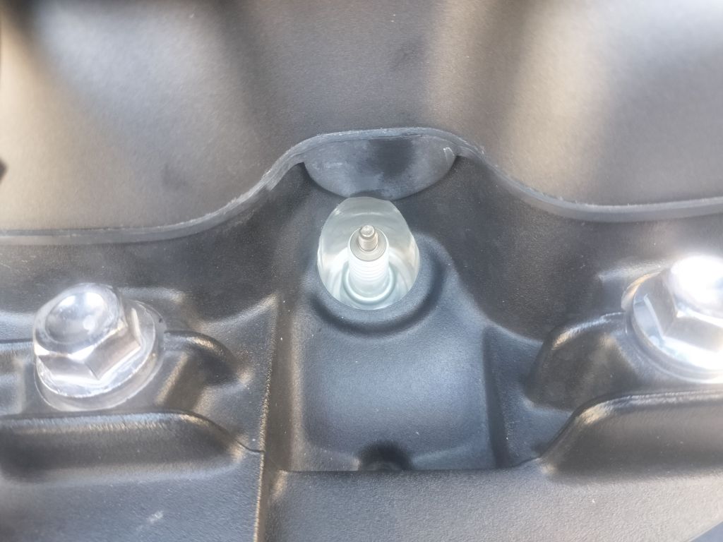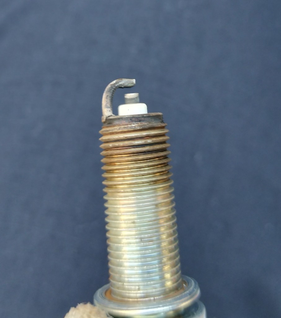 ODOMETERが10,000㎞を超えたので、プラグをチェックしました。前回はODOMETERが6,500㎞のときでした。車体右側から作業を開始しました。プラグキャップを外し、エアダスターでプラグ周辺の埃を飛ばして除きます。プラグレンチでプラグを回し、プラグを外しました。プラグの接点はあまり丸まったり摩耗した感じはないのでは…と思います。色もこんな感じなのでしょうかね。異常な色ではないように思います。異常がなさそうなので、外すのと逆の作業でプラグを戻しました。