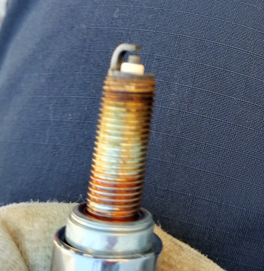 次は車体左側のプラグを外しました。手順は車体右側と同じです。プラグを外してみると、結構色が異なるものですね。こちらはきつね色という感じです。これを見ると右側は白っぽい感じです。