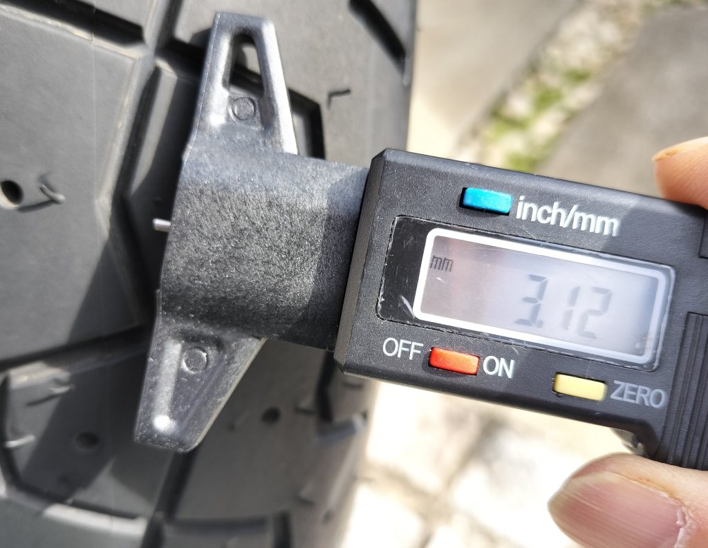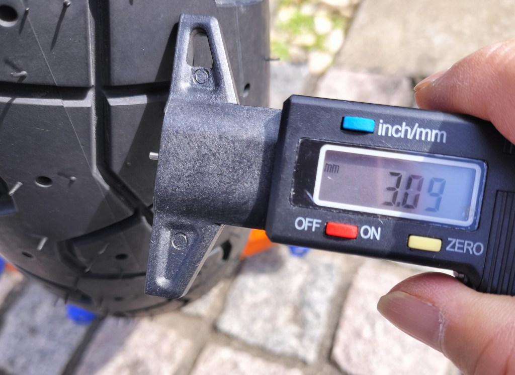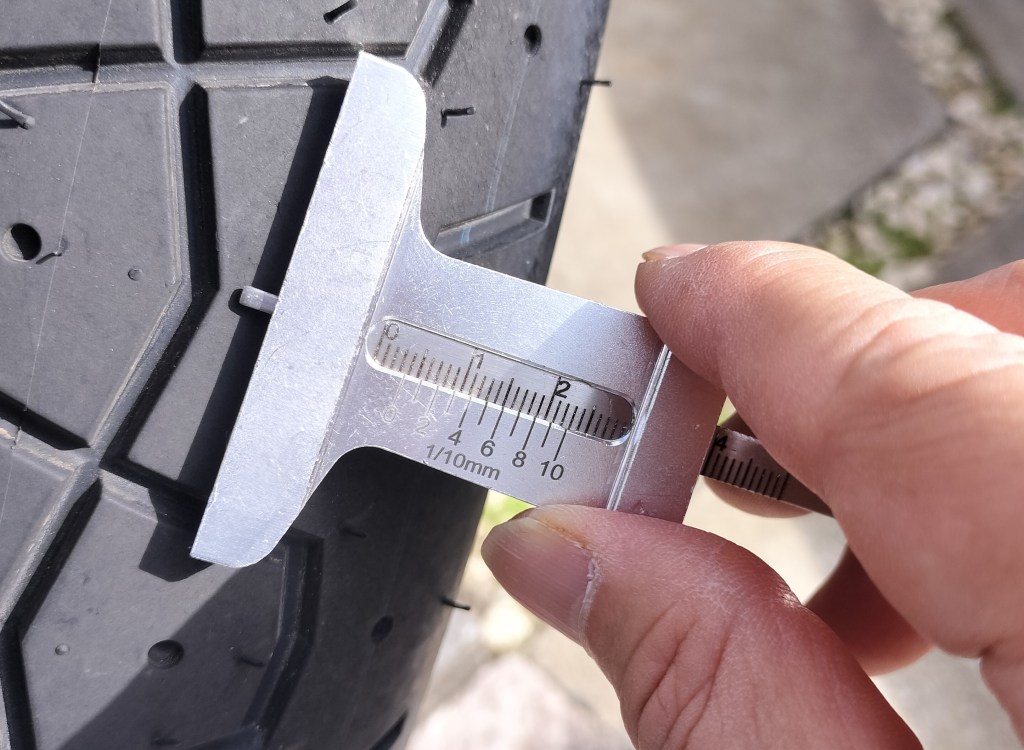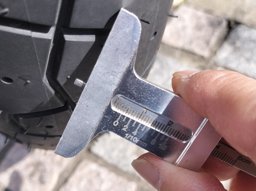 早速、新しいフロントタイヤの2か所を計測してみました。交換してから約250㎞走行しています。デジタルは3.12㎜と3.09㎜、アナログは3.8㎜と3.8㎜でした。やはりデジタルの方が数値が小さく出る傾向があるようです。どちらがより正確なのかは不明です。こういうときはプロセスが目視できるアナログに安心感を感じてしまいます。これからも節目節目で溝の深さを計測するので、その差の出方を比較しようと思います。