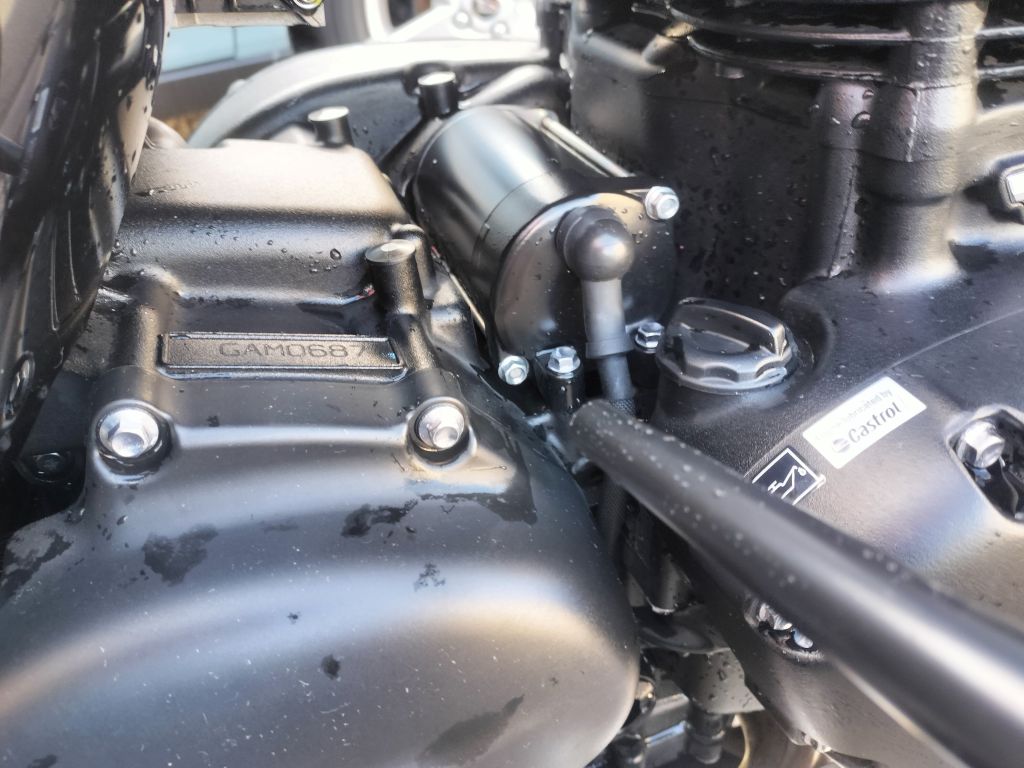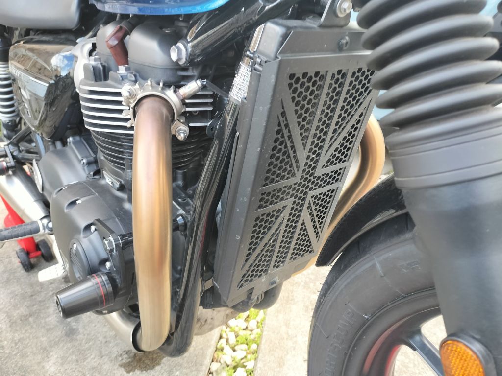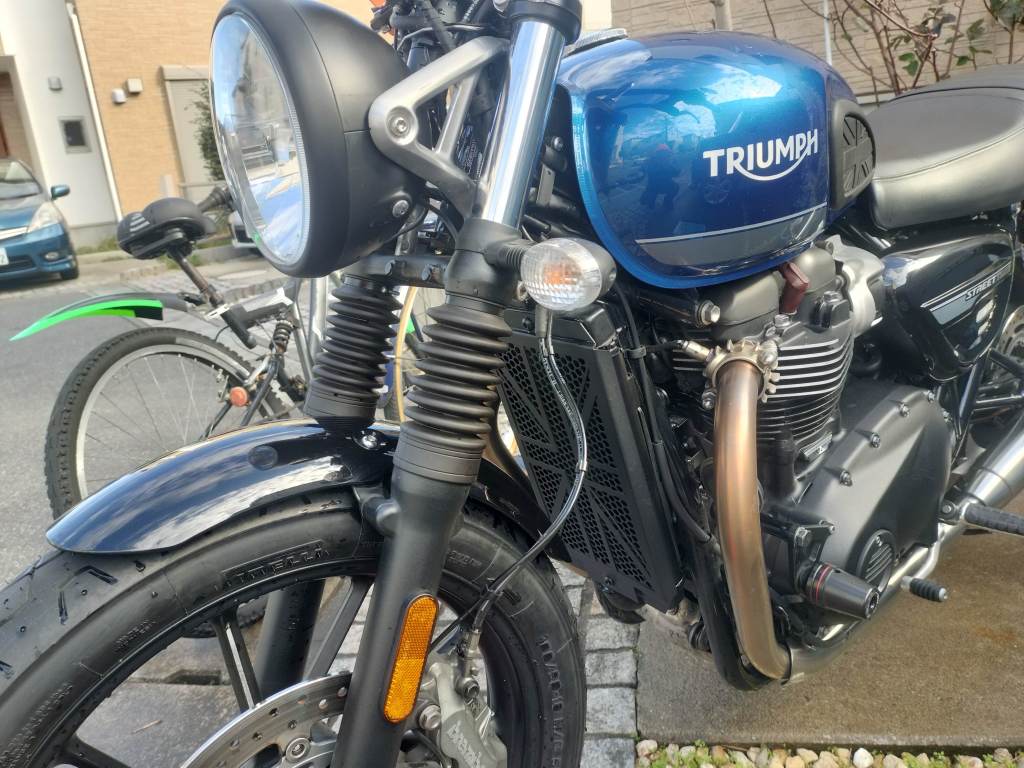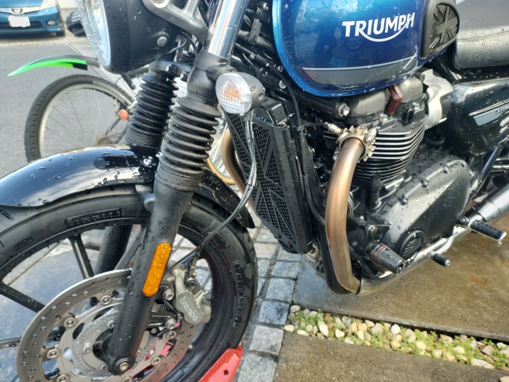 フロントタイヤを交換したし、しばらく洗車をしていなかったので、Street Twinのをキレイに洗車することにしました。洗車前のStreet Twinを見ると、やはり汚れが目立ちます。リヤのチェーンが近いところは油汚れが多く、そのほかは埃っぽい感じです。ラジエーターガードの周囲は、前輪が巻き上げた土などのようです。