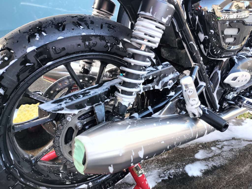 バイクシャンプーを使ってシャンプーしました。多くの場所は、シャンプーを含ませた四角いスポンジを使って軽く洗いました。エンジンのフィンや奥まったところはオレンジ色のブラシを使い、ホイールは白いブラシを使いました。Street Twinが泡に包まれています。