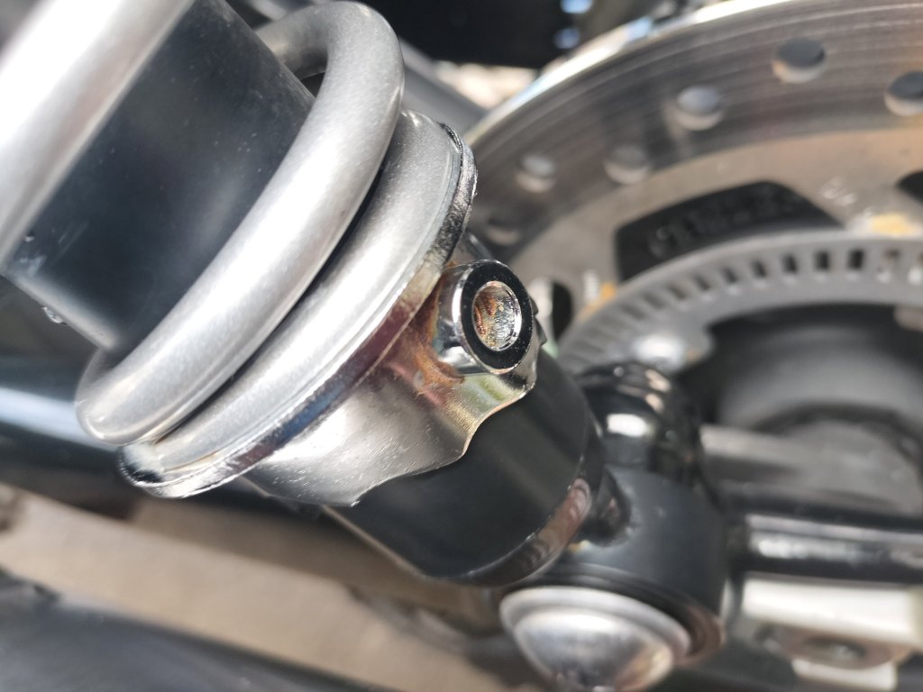 もう1か所は左後ろのショックです。完全に錆を取りきることは、これまでもできませんでした。そのせいか、錆が再び大きくなっていました。これまでと同様に歯ブラシにメタルコンパウンドを付けて擦った結果、錆を除くことができたようです。錆が少し残っているようなので、また広がる可能性がありますが、見栄えは少し良くなりました。今後も定期的に錆を取り除く作業が必要になりそうです。