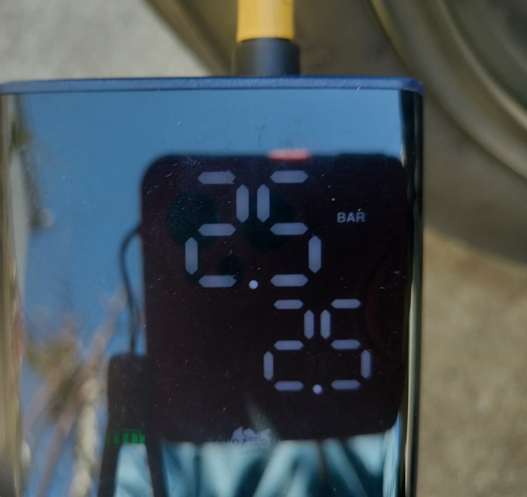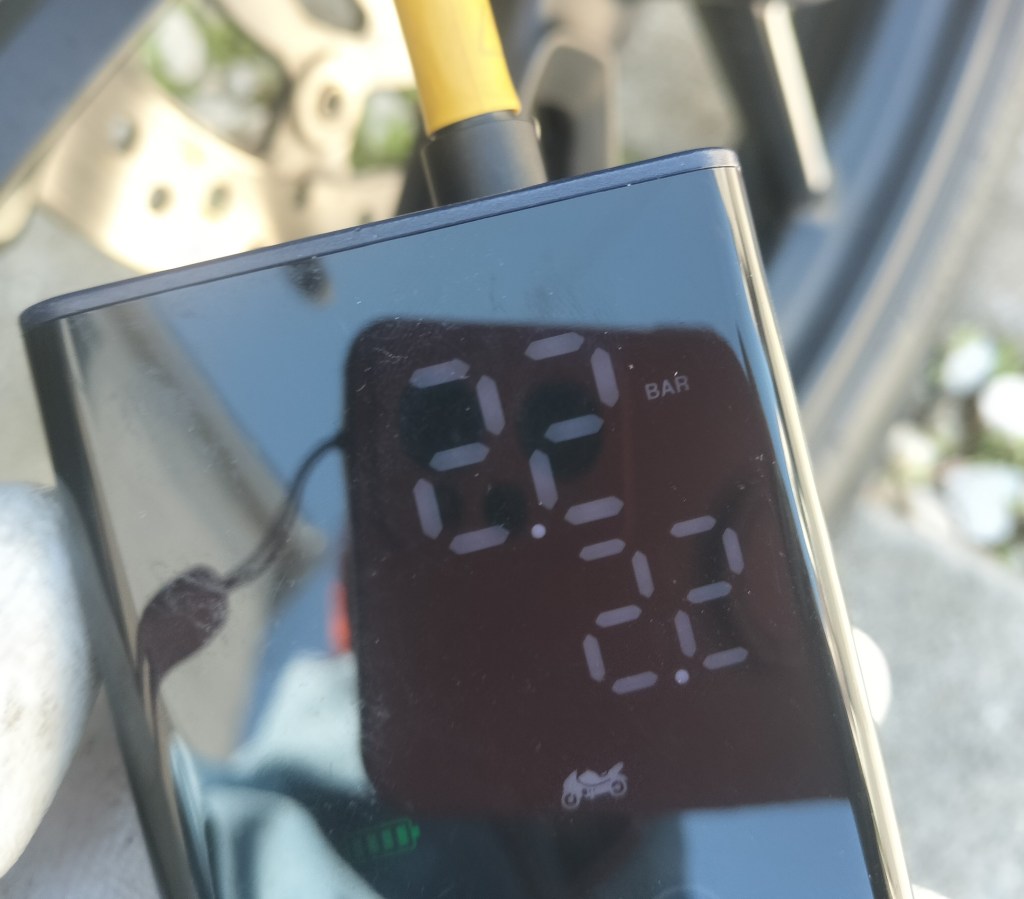 リヤタイヤの空気圧を計測すると2.5Barでした。フロントタイヤ交換時にAirを充填してもらったので、少し減少していると思ったのですが、減少していないようです。試しに2.5Barまで充填しようとポンプを起動しましたが、ポンプは作動しませんでした。しっかり2.5Bar充填されているようです。
