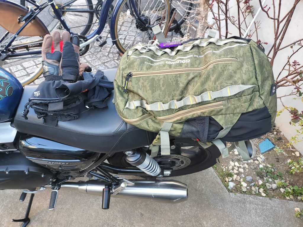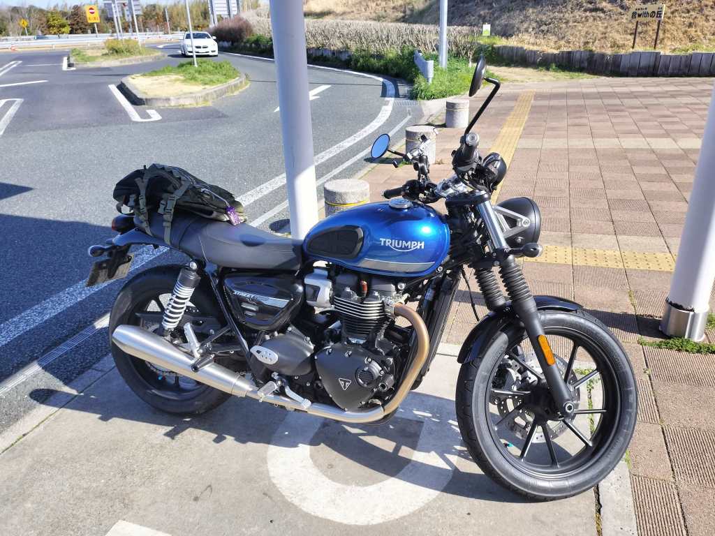 久しぶりにStreet Twin とツーリングに行くことができました。今回は千葉県の房総半島へ行きました。リュックに必要なものを収納し、シートに固定して出発です。館山道を走り、途中の君津PAで友人と合流しました。朝食に蕎麦でも食べようと思っていたのですが、君津PAにはトイレと飲料の自販機しかありませんでした…。もっと下調べすればよかった。