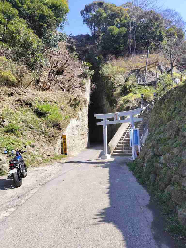 君津PAから館山道を降りることができるので、君津PAから一般道で向かいました。Google Mapにナビゲーションしてもらったのですが、うっかり通り過ぎてしまいましたが、なんとかたどり着きました。切通しトンネルを一旦通り過ぎると東善寺側に出ました。狭いけどバイクが何台か駐車できるスペースがありました。東善寺へ上る階段もありました。