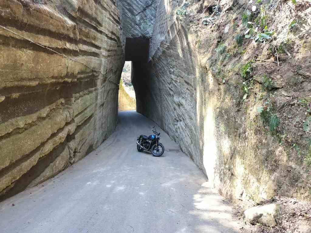 この切通しトンネルは狭いので、バイカー同士で順番にバイクを停め、手際よく画像に納めます。最初は遠くからの画像になりましたが、少しバイクに寄るなどしてStreet Twin とトンネルのお気に入りアングルで画像を撮影しました。インターネット上で紹介されているような画像を、自分のStreet Twin で撮影することができました。満足です。
