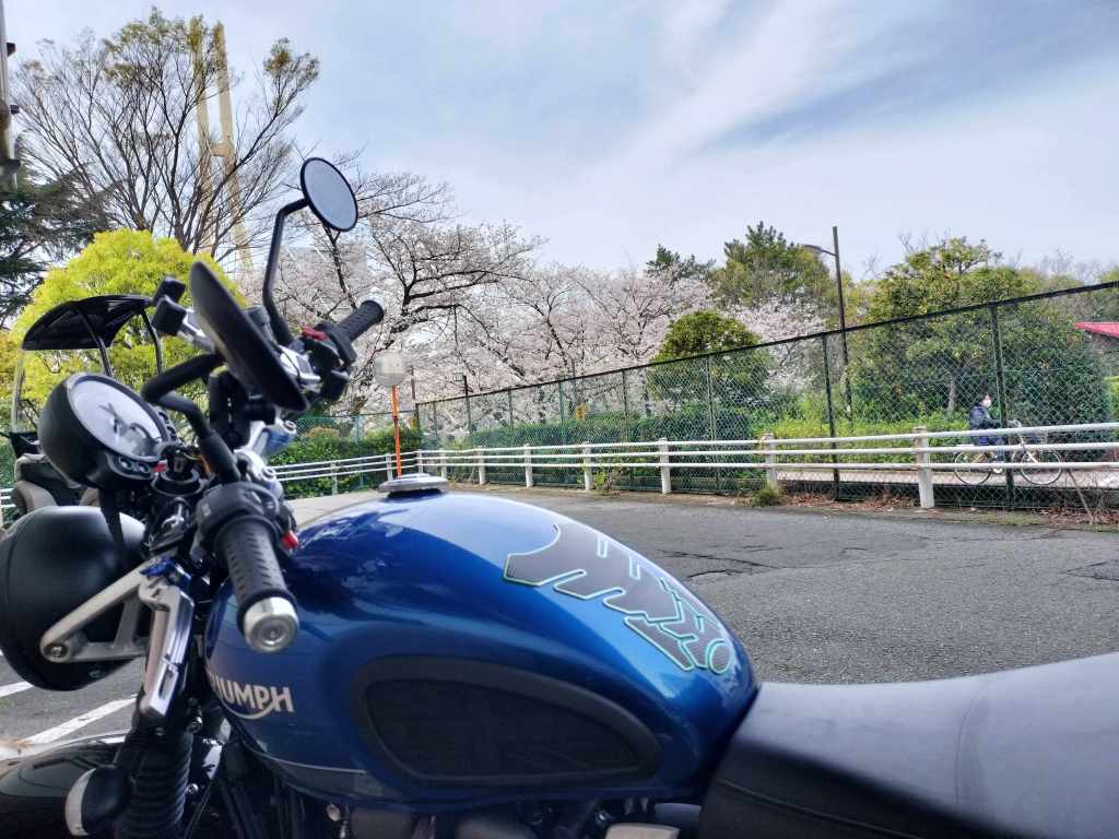 ここの店舗が入っているショッピングモールに駐輪場があるのですが、バイクを駐車するには狭い場所でした。自転車ならいいのですが、少し奥にあったので、バイクだと厳しい感じです。そのため、納品する車が通る通路をバイクの駐車スペースとして使う人が多いようでした。このときは4月初旬でしたので、まだ桜が咲いていました。暖かく気持ちいいツーリング日和でした。