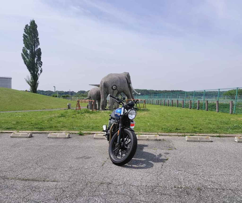 Google Mapで気になっていた公園へ行きました。双子公園という公園なのですが、双子のゾウが印象的な公園です。印旛沼の傍らにあるのですが、思ったより小ぶりな公園でした。ゾウは駐車場の近くにあるので、Street Twin と一緒に撮影することができました。