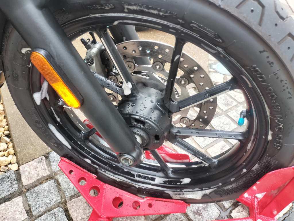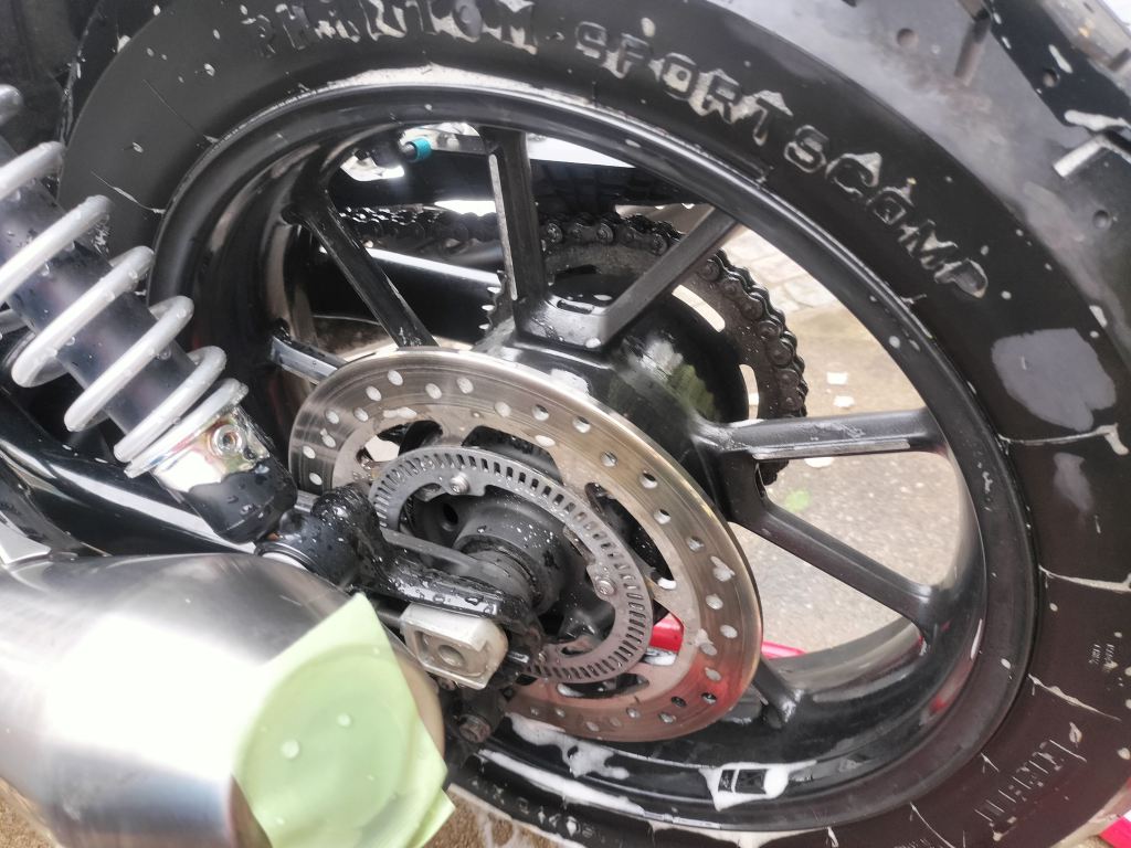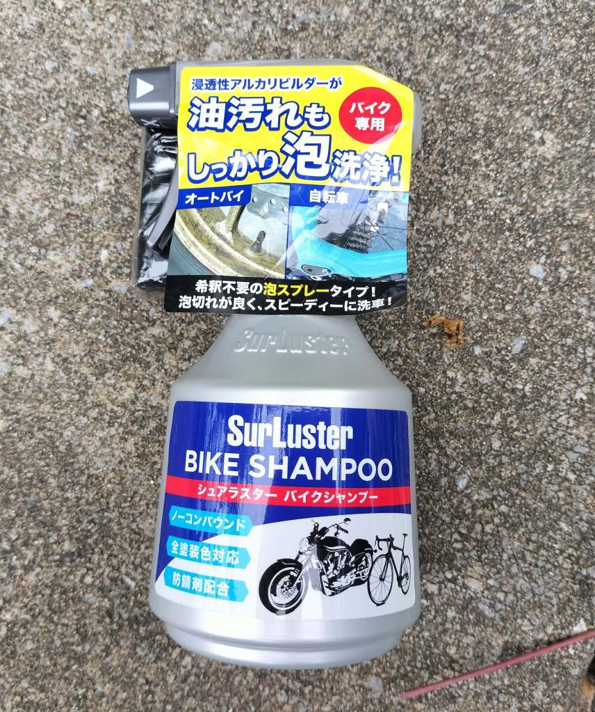 今回からシュアラスターのシャンプーを使うことにしました。だいぶ以前に買ったので、少し外見がくたびれてしまいました…。もう少しこまめに洗車しないといけないかもしれませんね…。シュアラスターはスプレー式なので、バイクに直接シャンプーを吹き付け、水を含ませたスポンジで柔らかく洗いました。使いやすかったです。リヤホイールの油汚れもそこそこ落ちたように思います。