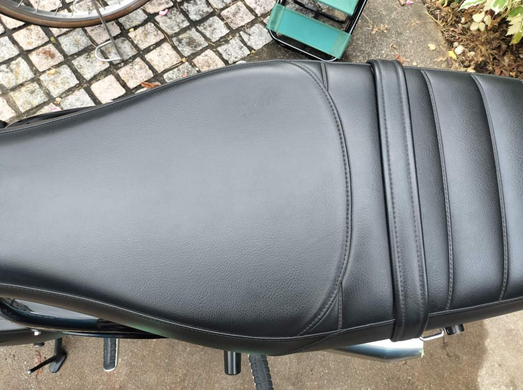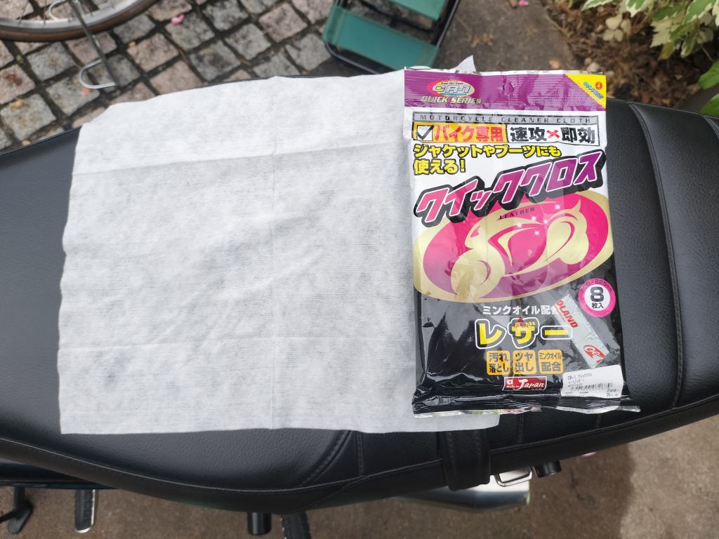 洗車とチェーンメンテナンスが終わったので、シートも清掃することにしました。雨上がりの濡れた路面を何回か走行したので、洗車前のシートは少し汚れていました。洗車のときに流水で大きな汚れを落としたので、見た目キレイになっています。
