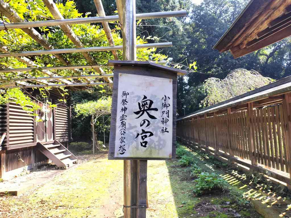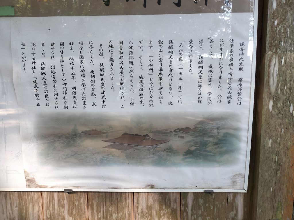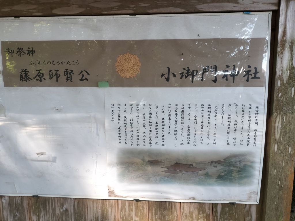 小御門と書いて「こみかど」と読むようです。事前になにも勉強をせずに行ったのですが、下のWebにあるように「身代わりの神」でした。鳥居をくぐると、右手に由緒が記載されていました。