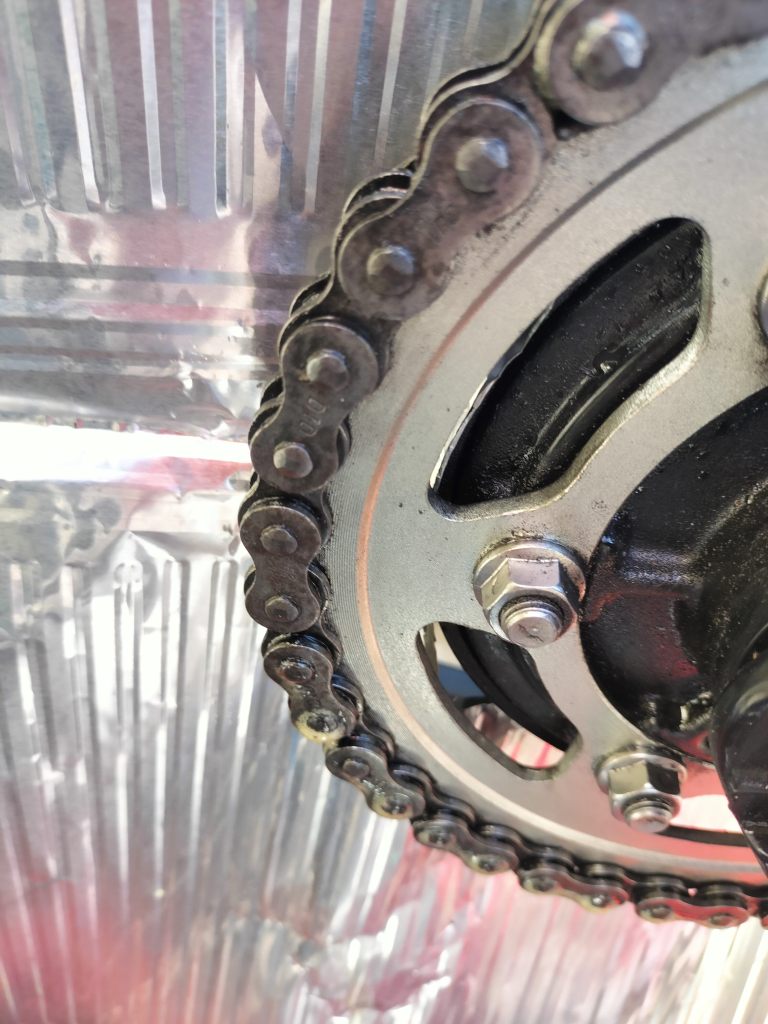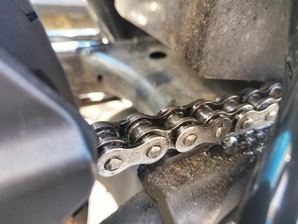洗車が終わったので、チェーンをメンテナンスしました。500㎞ほど走っているので、そこそこ汚れています。見た感じでは、錆はなさそうです。