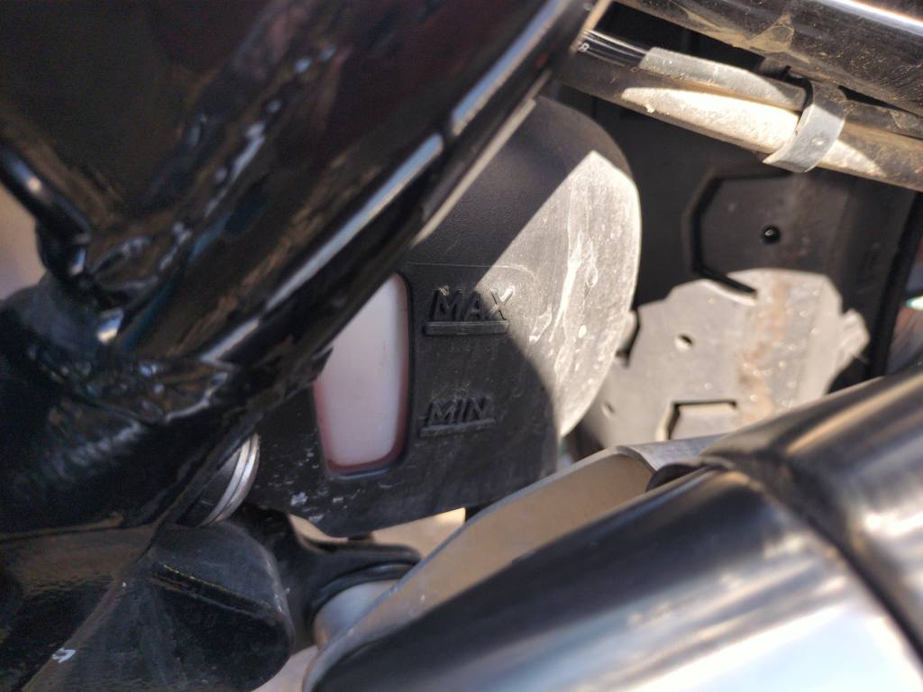 ODOMETERが14,000㎞を超えたので、2,000㎞毎に行っている素人点検を行いました。フロントホイールクランプとメンテナンススタンドを使用しているので、車体はほぼ垂直です。いつもながらですが、エンジンオイルは少なめに見えます。でも、いつも通りといえばいつも通りです。冷却水に減少などは見られない感じです。