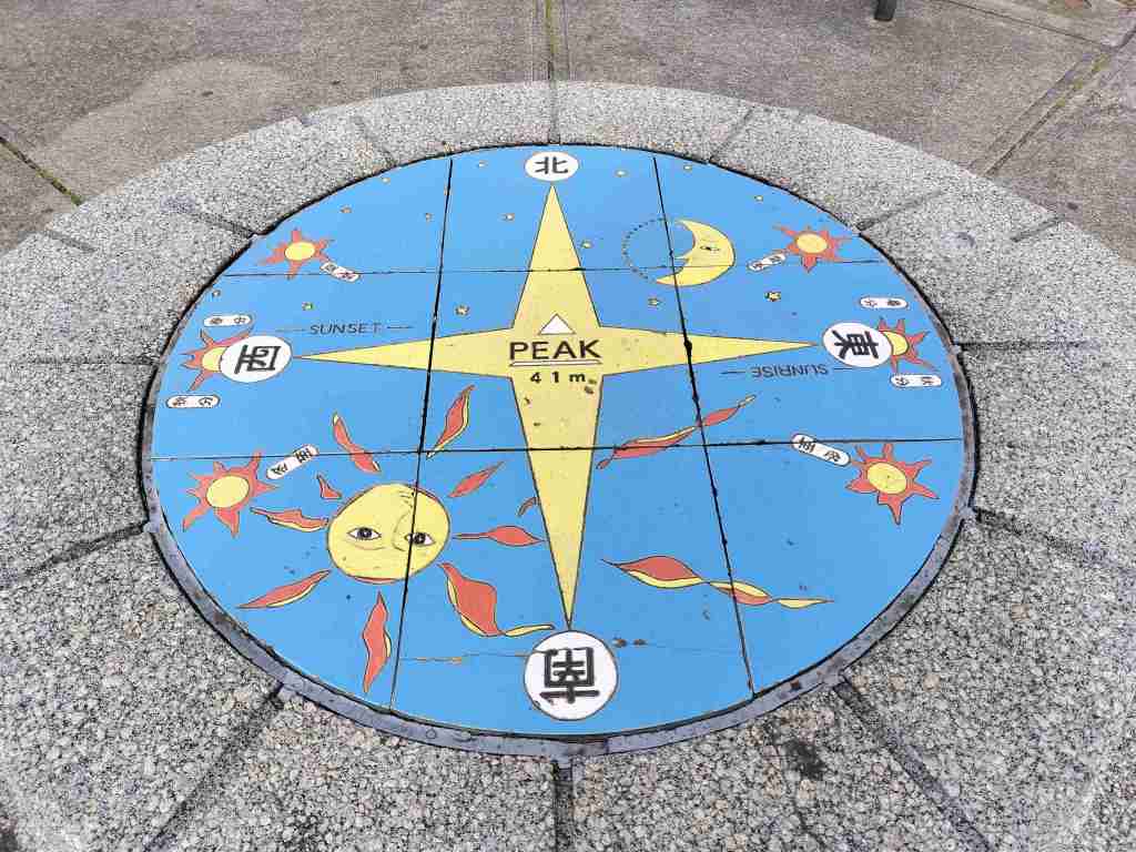 展望山は階段で昇ります。昇ると、さらに道があり、らせん状の道を通って頂上へ行きます。頂上には方位を示すプレートのようなものがあります。