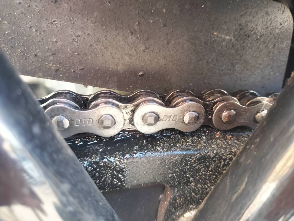 YAMALUBEのチェーンクリーナーを吹き付け、軽くブラシをかけ、ウエスで拭き取りました。きれいになりますね。