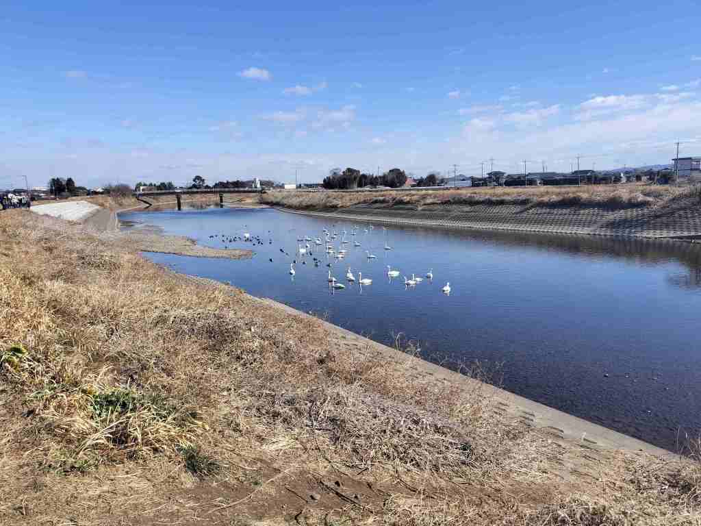 Google Mapのクチコミでは、少し下流に行くと見ることができそうだったので、行ってみることにしました。少し周辺をStreet Twinと探索したところ、少し下流の対岸から白鳥を見ることができました。時期のせいか、数は少なかったですが、白鳥を見ることができて満足です。他にも散歩がてら見に来る人がちらほらいました。