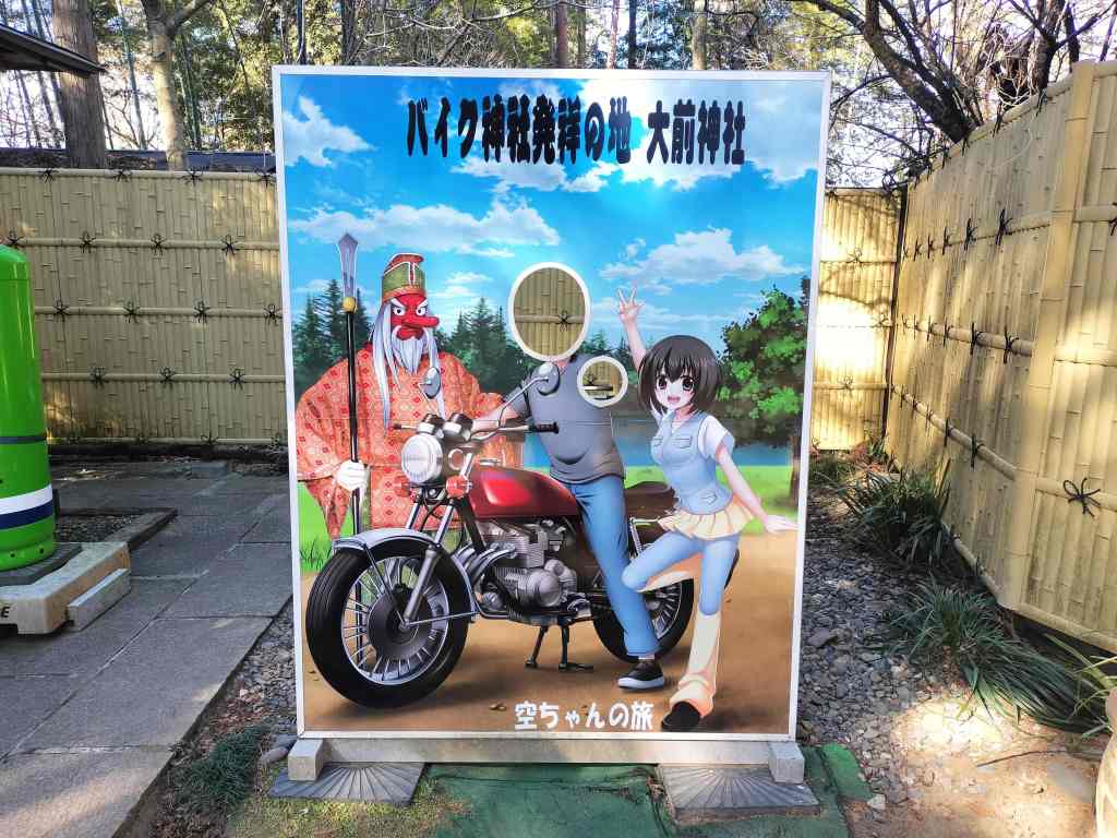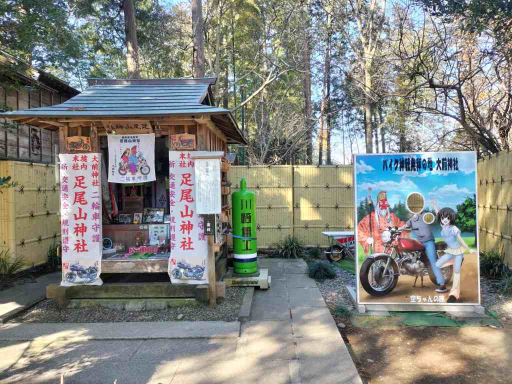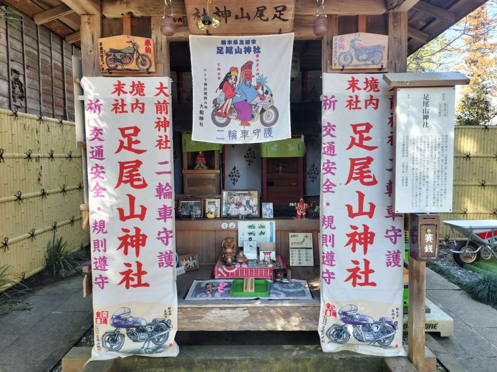 五行川白鳥飛来地で白鳥を観たあと、栃木県真岡市の大前神社内にあるバイク神社、足尾山神社へ行きました。Google Mapを見ると、YAMAHAのロゴが入ったネコ車などがあったみたいです。画像では、大きなパネルの後ろにネコ車が少し写っています。チェックが甘かったです。