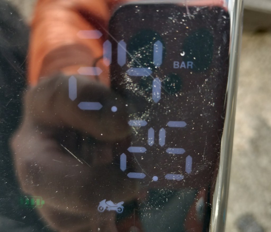 リヤは2.4Barまで低下していたので、2.5Barまで充填しました。空気圧が下がっていますが、パンク修理の影響はなさそうです。しばらく、このまま乗り続けようと思います。