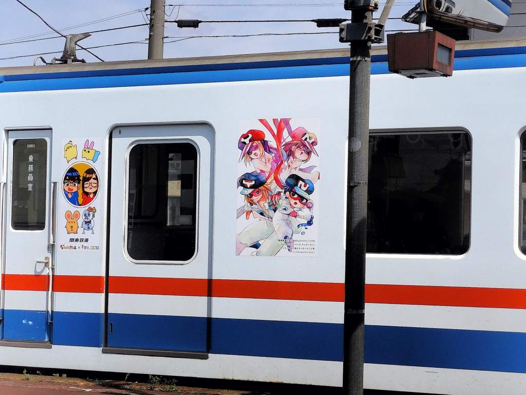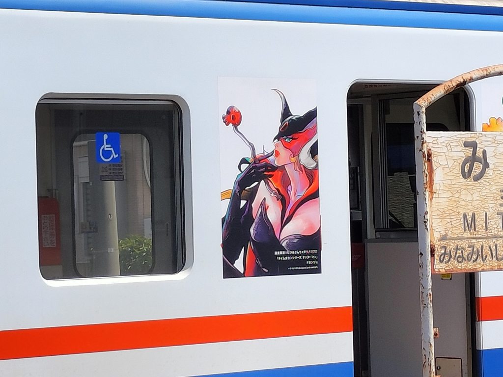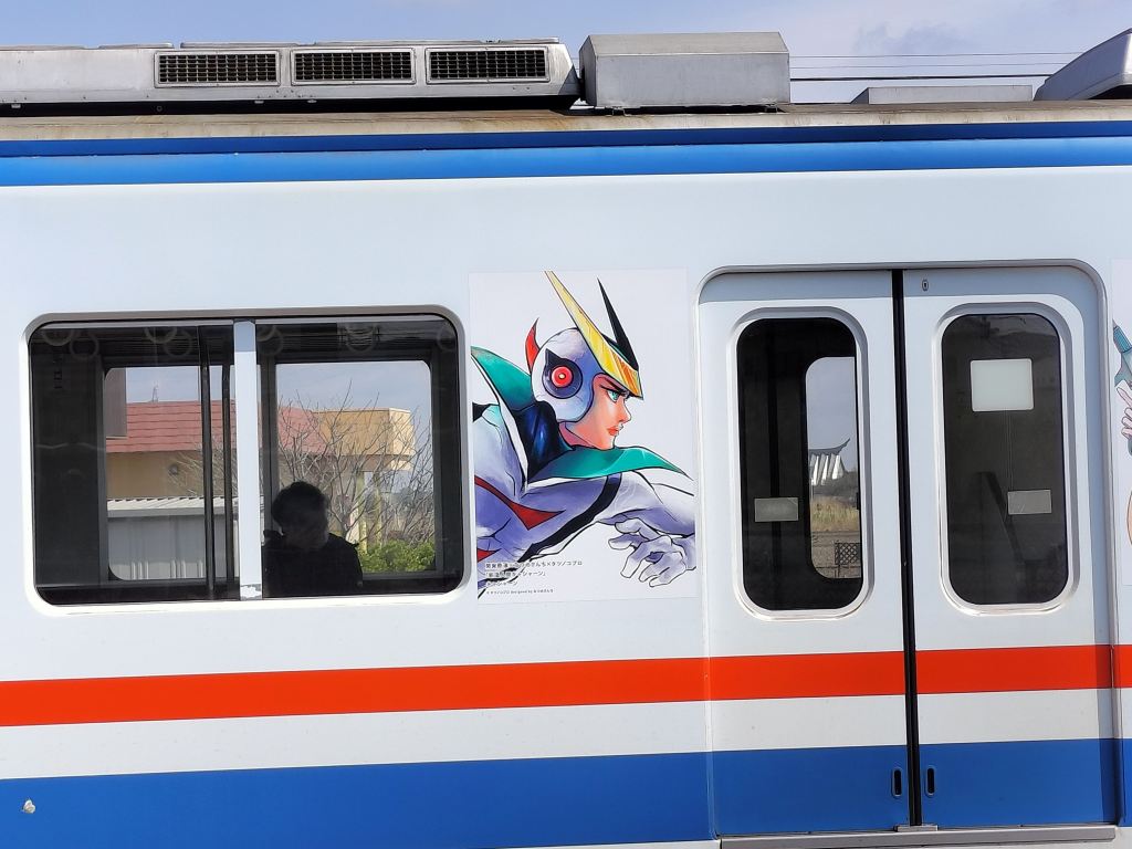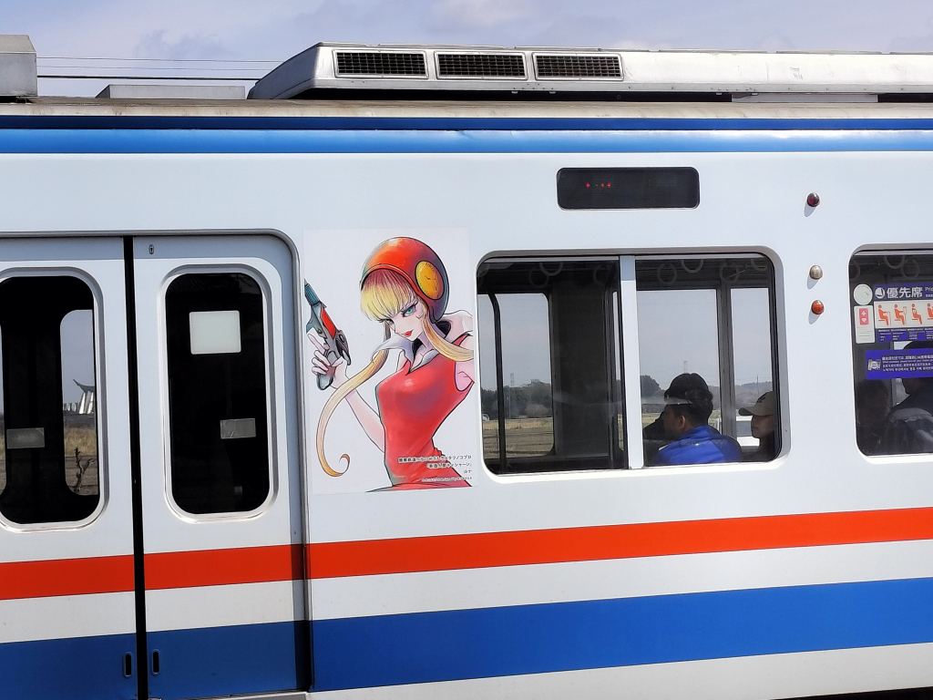 しばらくボーっとしていると、電車が入ってきました。車体にはアニメのキャラクターがペイントされています。