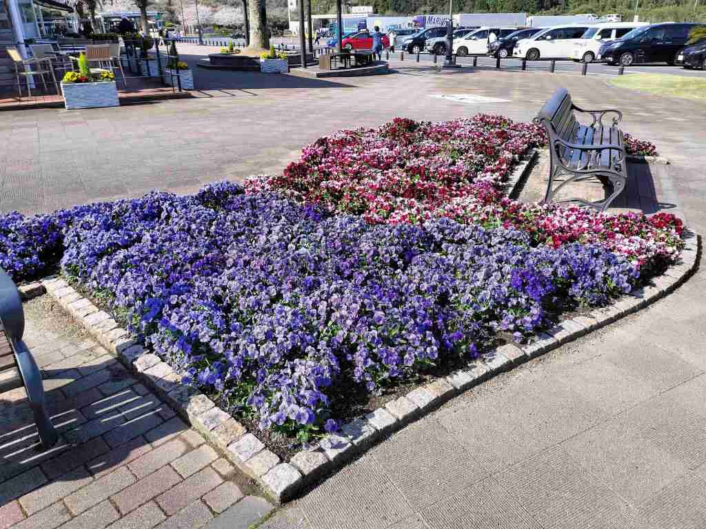 早くついてしまったので、サービスエリアの中をブラブラしていました。暖かくなってきていたせいか、バイカーが多かったです。ただこの日は4月上旬で、朝の気温が5℃だったので、冬用のライディングウェアを着用しました。それでちょうどいいくらいでした。でも、草木にとっては春が来ているようで、きれいに咲いていました。