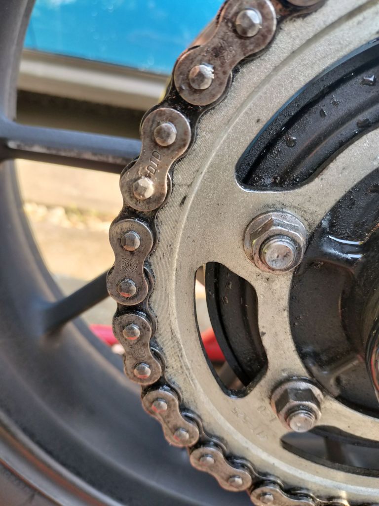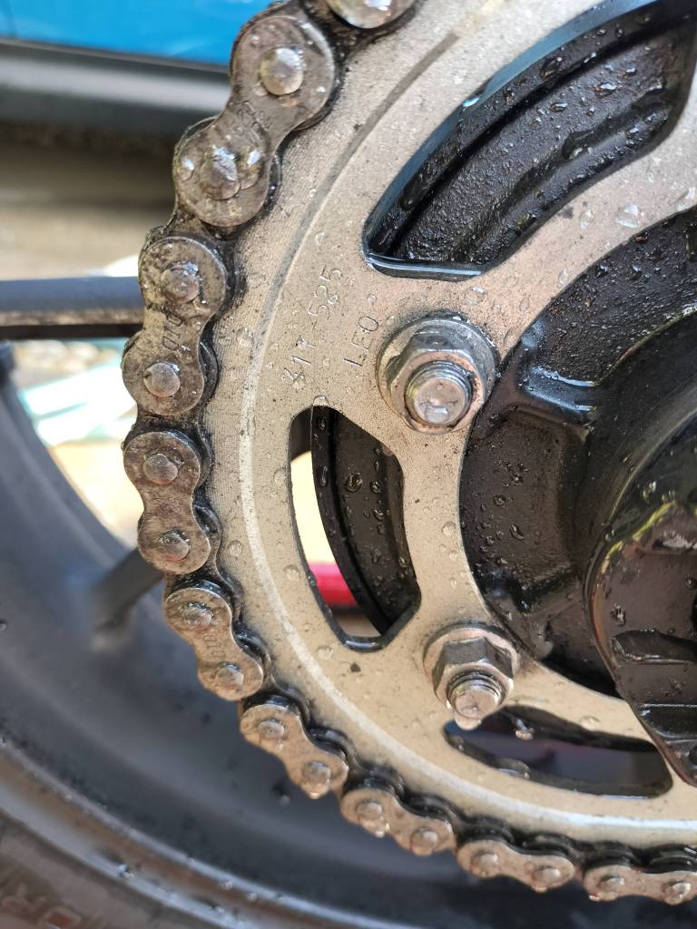 洗車が終わったので、チェーンメンテナンスを行いました。洗車後なので、画像のスプロケットには水滴が付いています。汚れ具合は500㎞走行相当でしょうか。