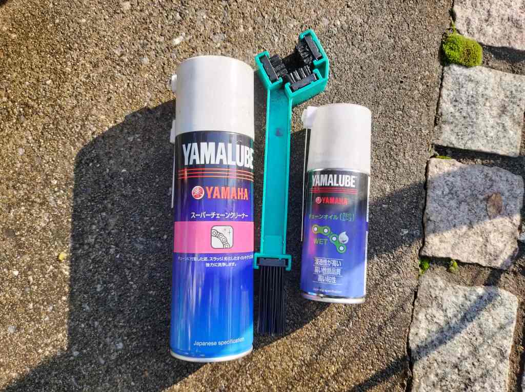 今回もYAMALUBEのチェーンクリーナーとチェーンルブを使いました。詳しくは分かりませんが、自分はこの組合せが好きです。メンテナンスは気持ちいいですね。