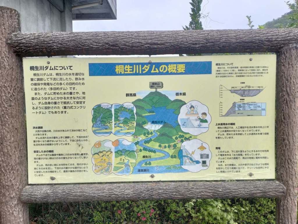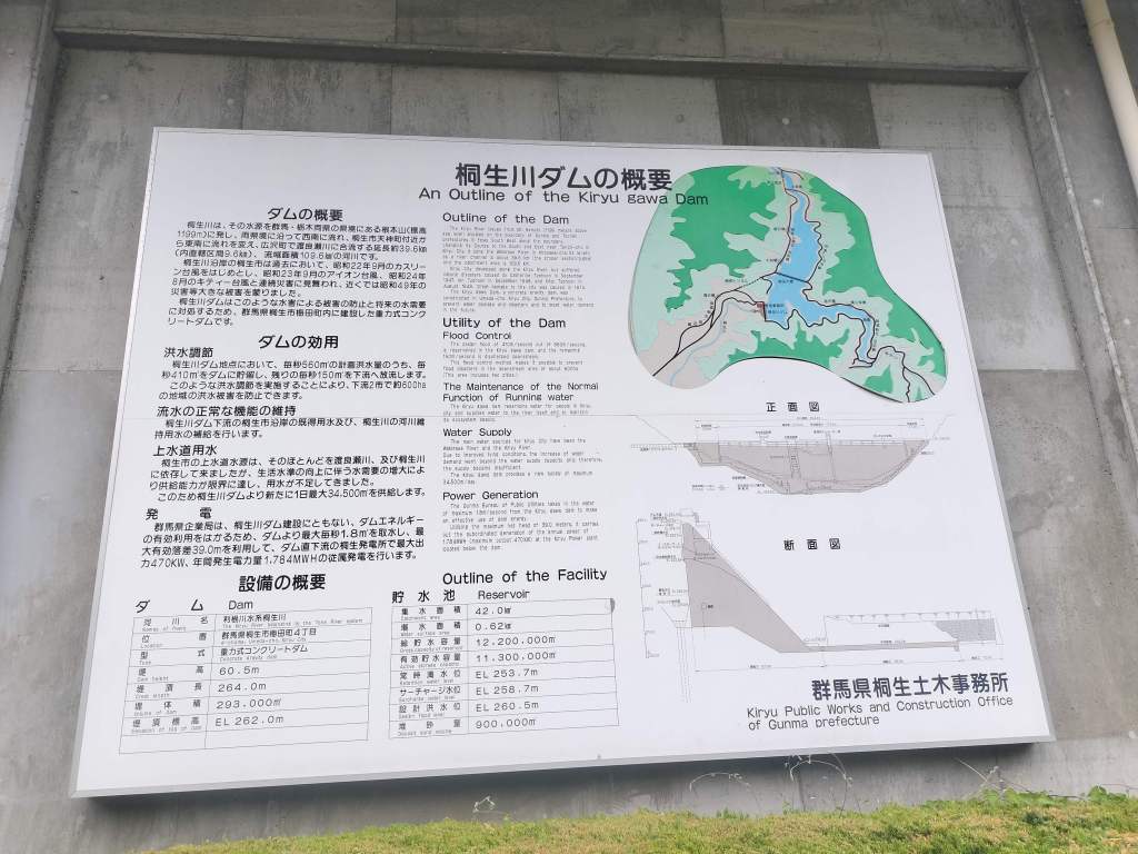 桐生川ダムの概要です。日本一大きいようなダムではないと思いますが、大きい構造物であることには変わりありません。こうしてみると、ダムは本当にコンクリートの塊ですね。