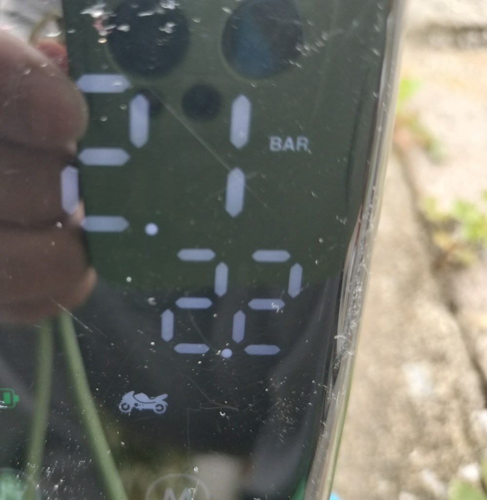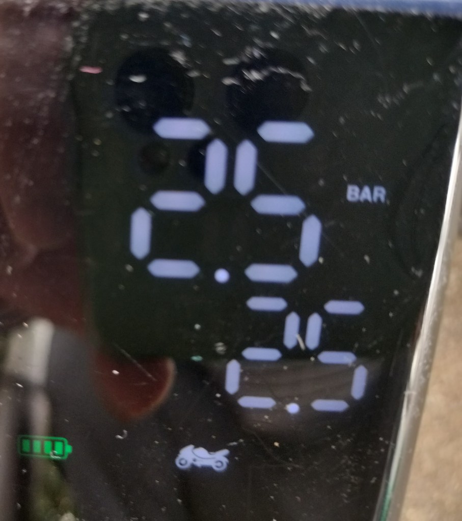 次はリヤです。測定してみると、前回充填した規定値2.5Barのままでした。充填しようとポンプのスイッチを押しましたが、動きませんでした。やはり2.5Bar入っているようです。今回は低下していませんでした。不思議ですが、タイヤに異常があるということではないと思うので、一安心です。またツーリングをゆるゆると楽しみたいと思います。
