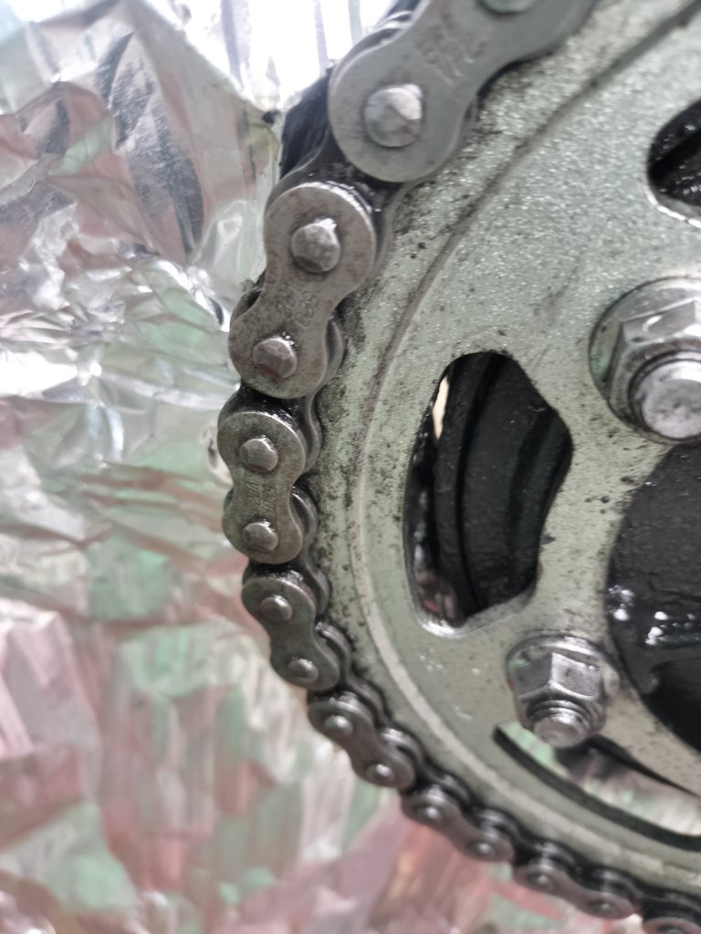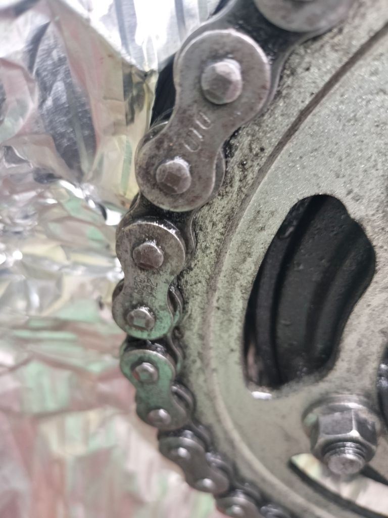 チェーンクリーナーを吹付け、軽くブラシを当て、汚れを落とします。念を入れてウエスで拭き取っているつもりなのですが、見た目はイマイチですね…。