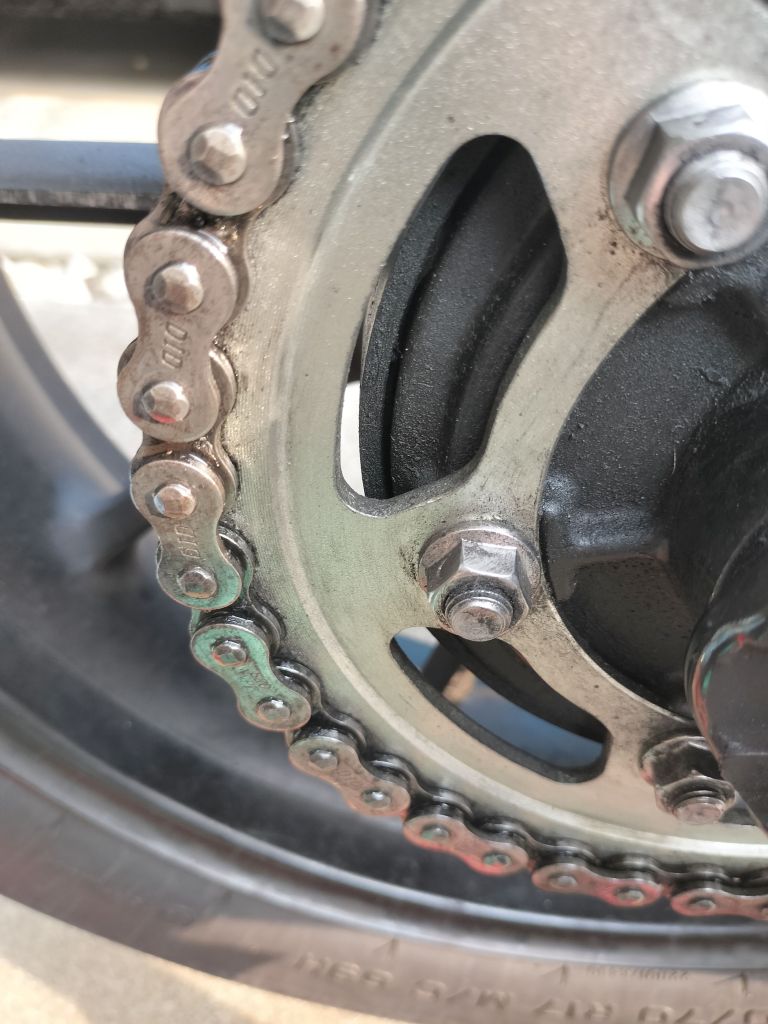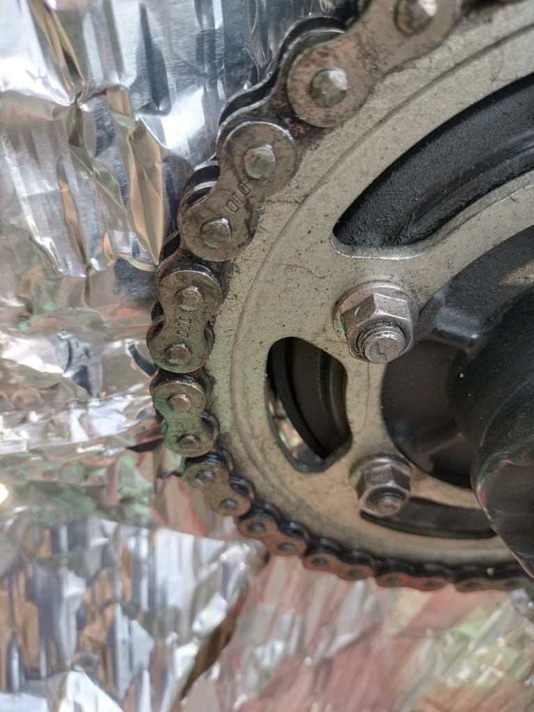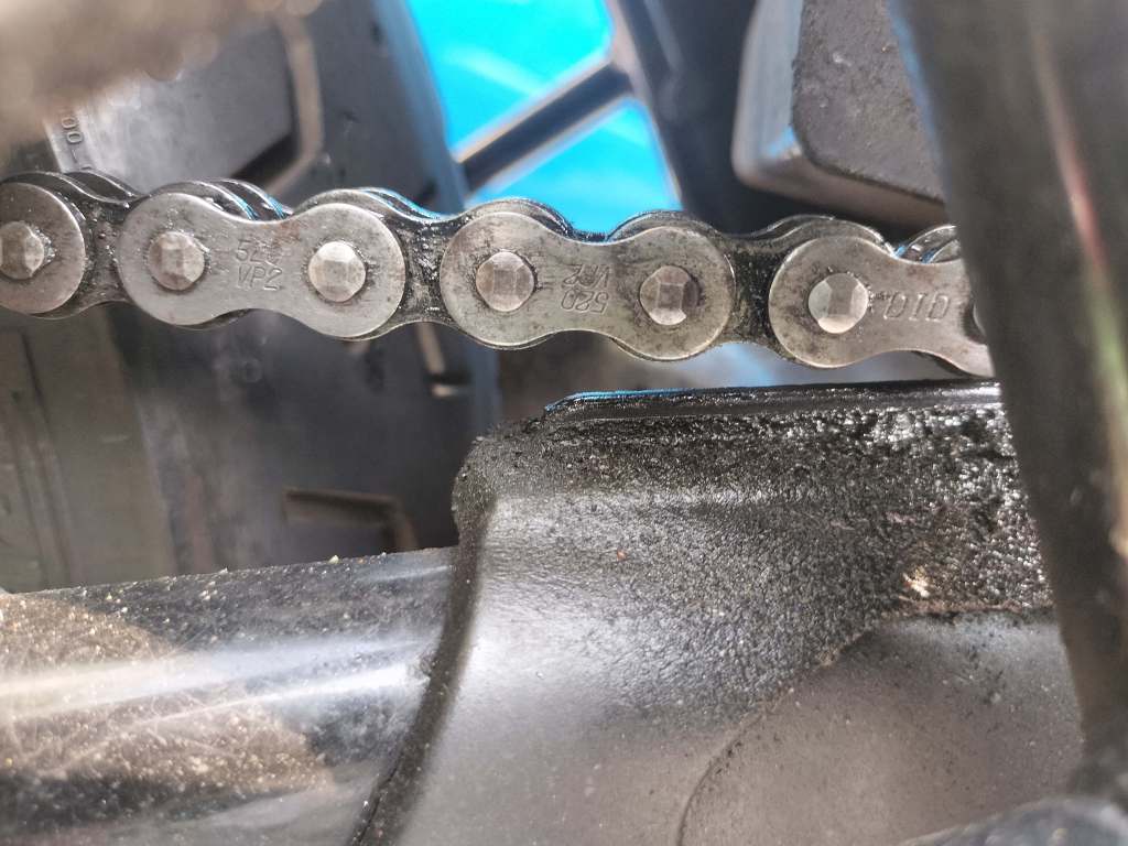チェーンクリーナーを吹付け、ブラシで軽く汚れを掻き出し、ウエスで拭き取ります。ピカピカとまではいきませんが、このときが一番キレイに見える時でしょうか。