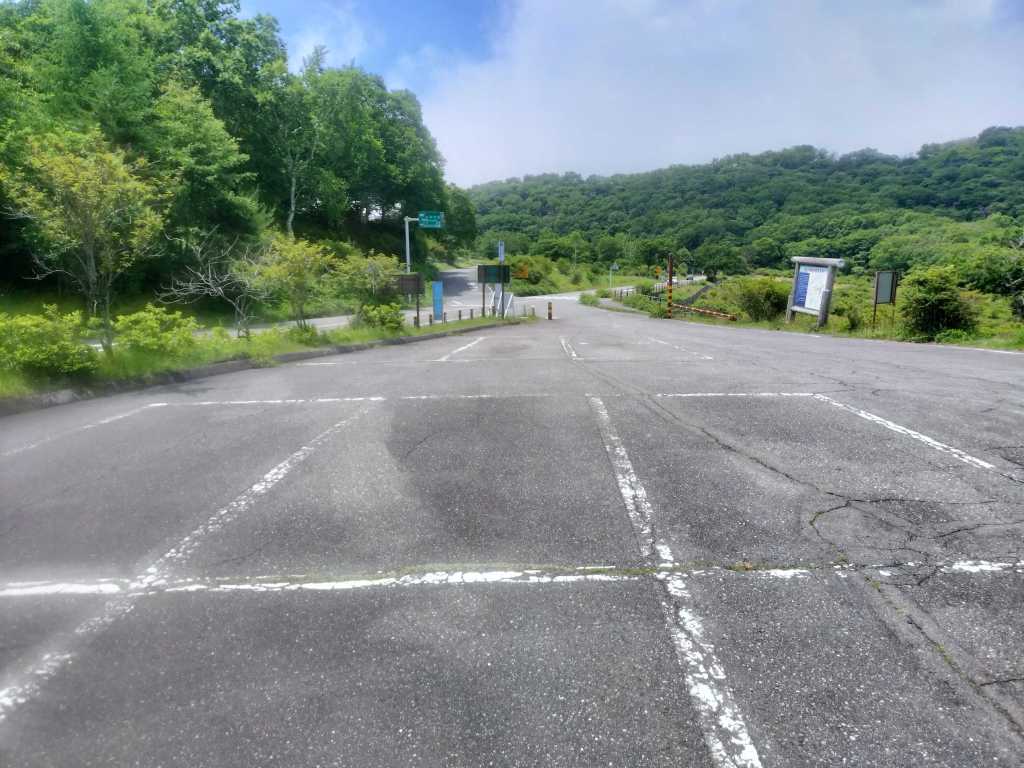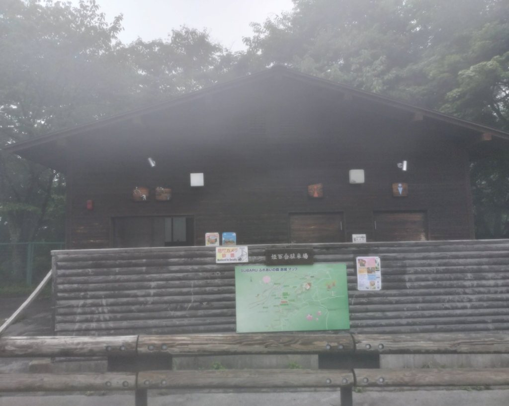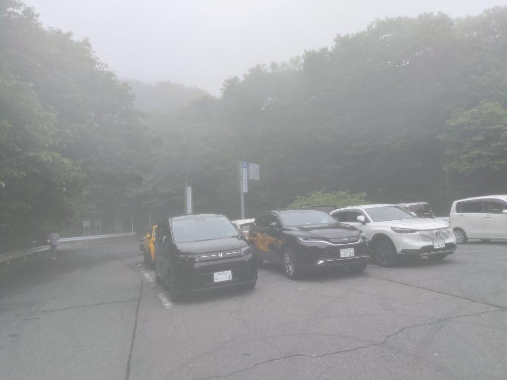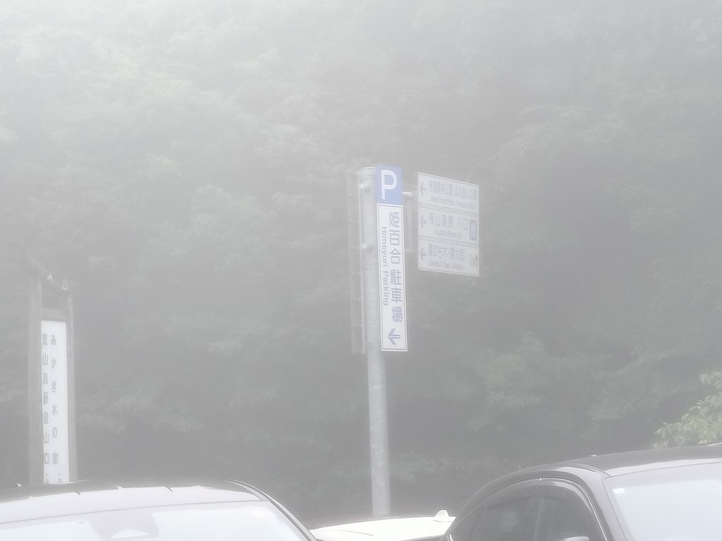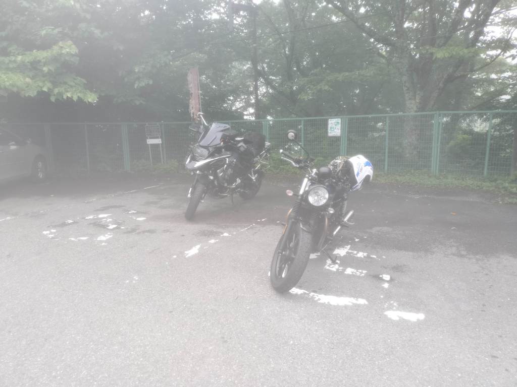 Street TwinとBMWで向かったのは、イニシャルDでは赤城レッドサンズが使用していたコースとされる山の下側にある姫百合駐車場です。ダウンヒルのゴールであり、ヒルクライムのスタート地点です。この日の天気予報は雨と無縁であったはずなのですが、赤城山を上り始めると路面がぬれていました。どうやら霧のようです。結構濃い霧であったので、見通しはよくありませんでした。姫百合駐車場の画像も霞んでいます。