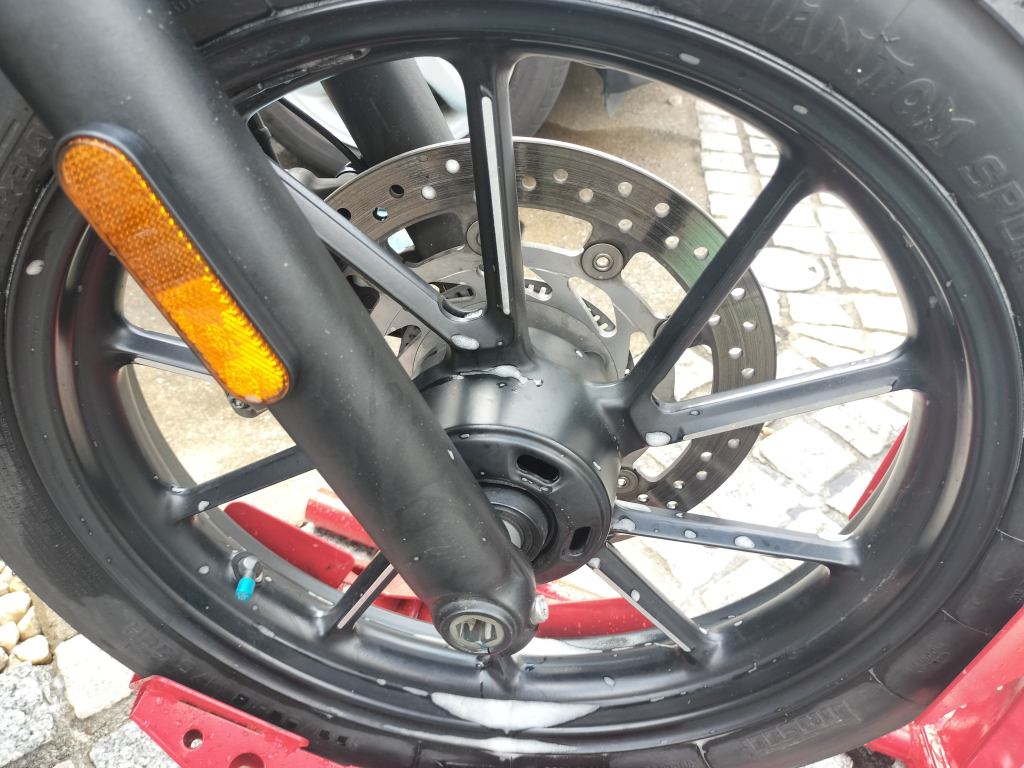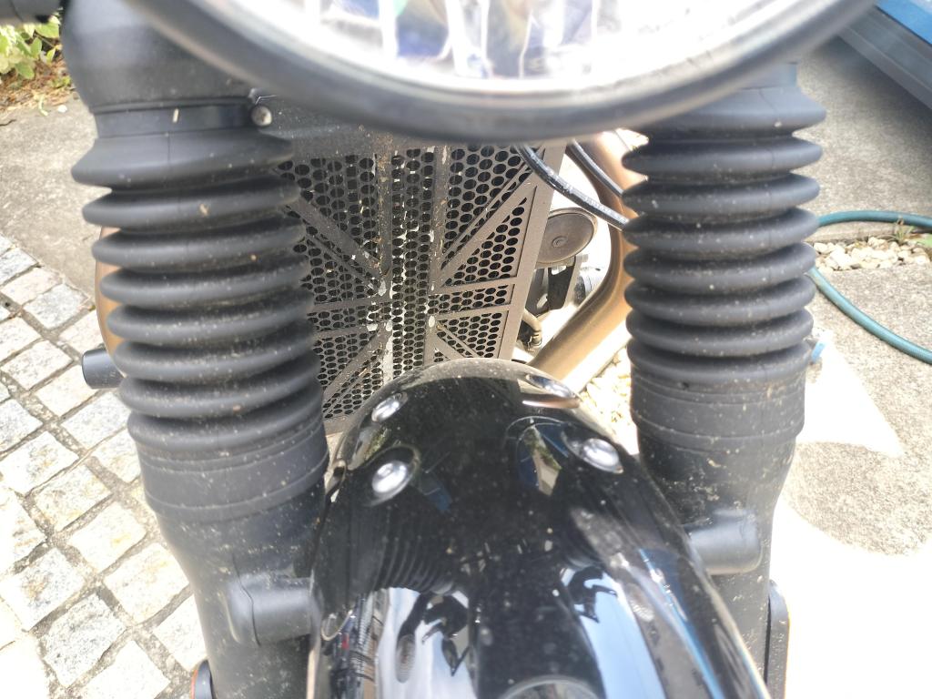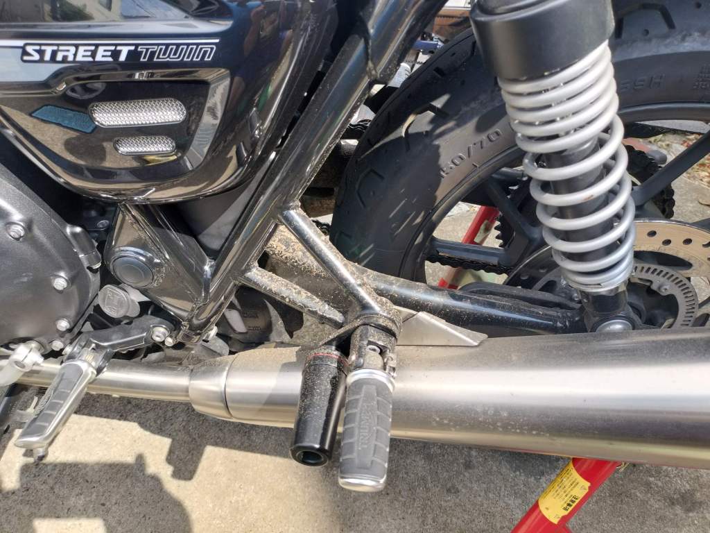 赤城山へのツーリングで霧の中を走ったこともあり、Street Twinがたいぶ汚れてしまったので、洗車することにしました。結構ドロドロですね。