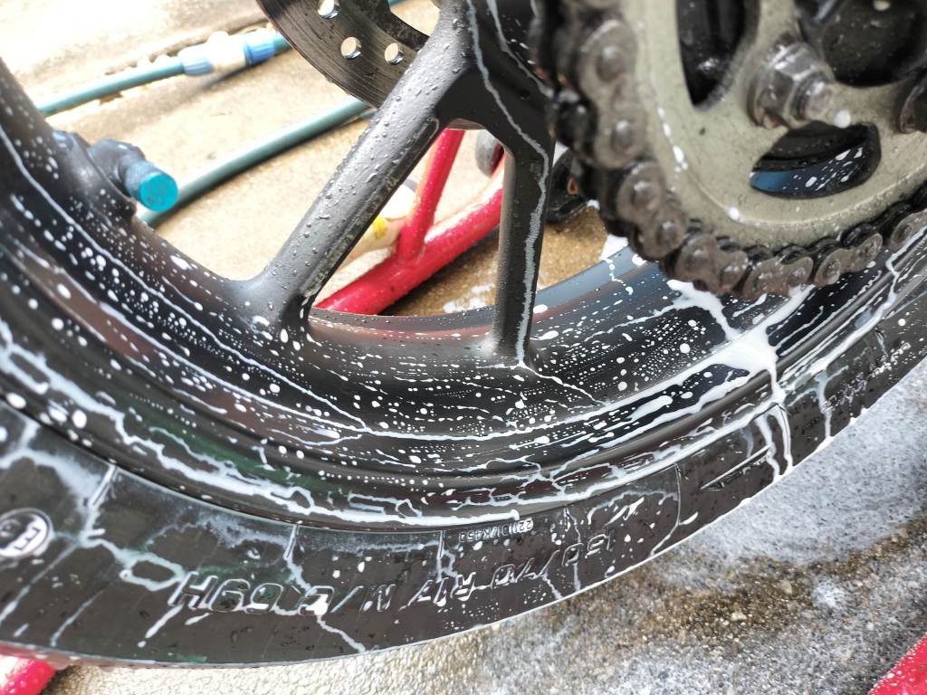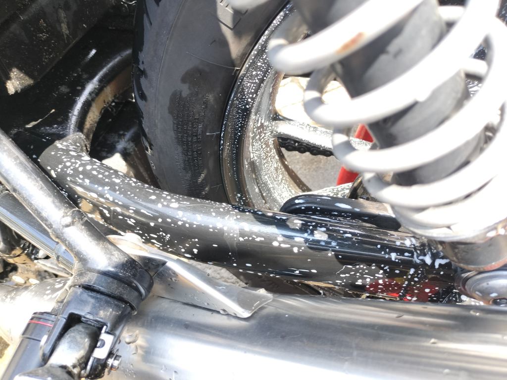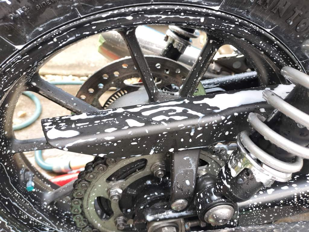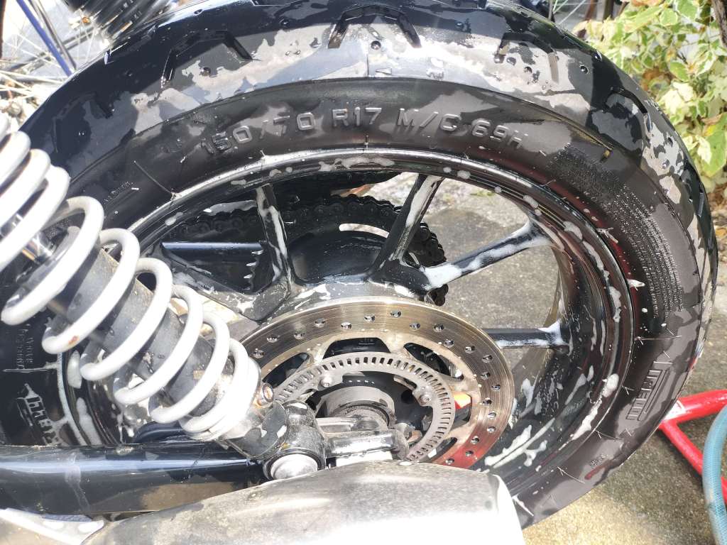 まずは水を流しながら手で大きなドロ汚れを落としました。タンクとかはほとんど汚れていないのですが、やはりリヤホイールやマフラー付近の汚れは油分が主体なので落ちないですね。