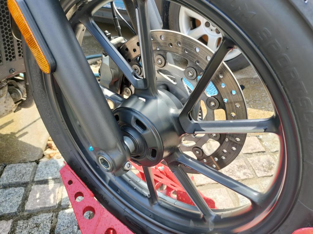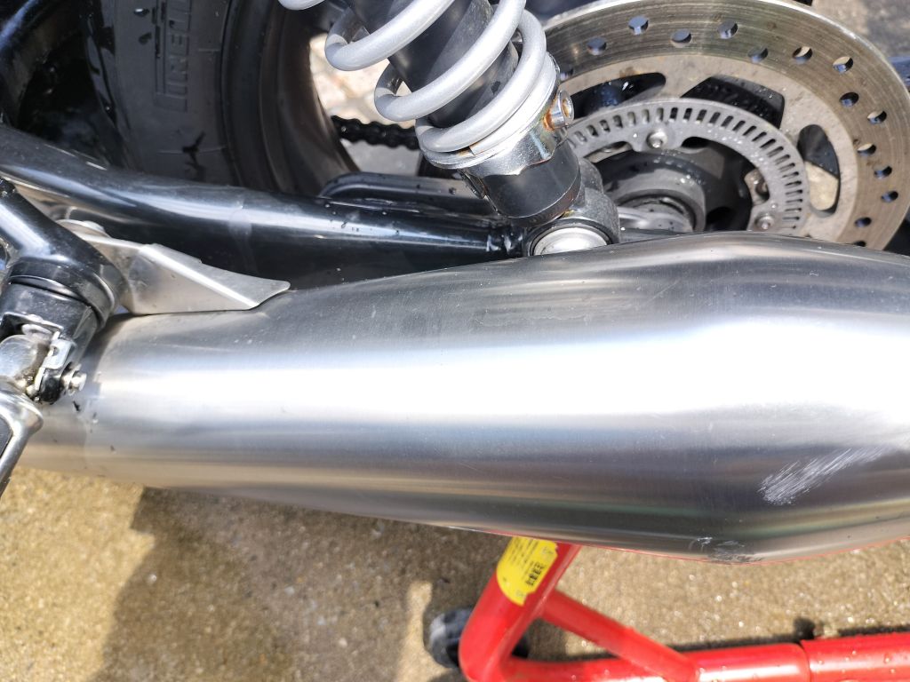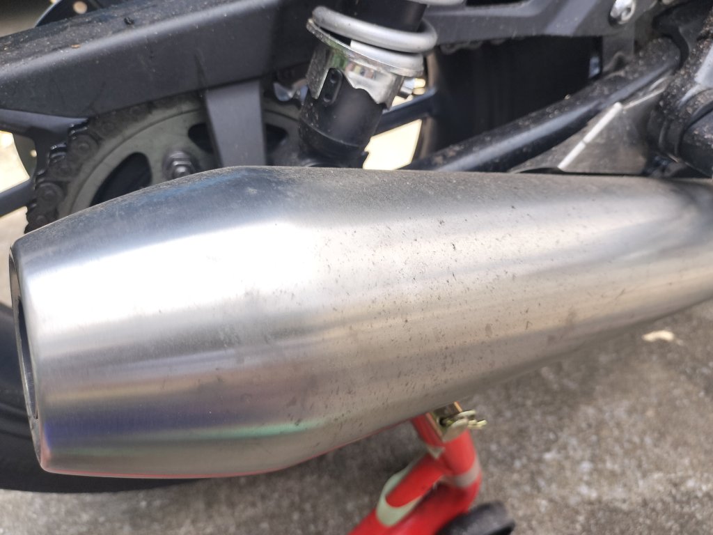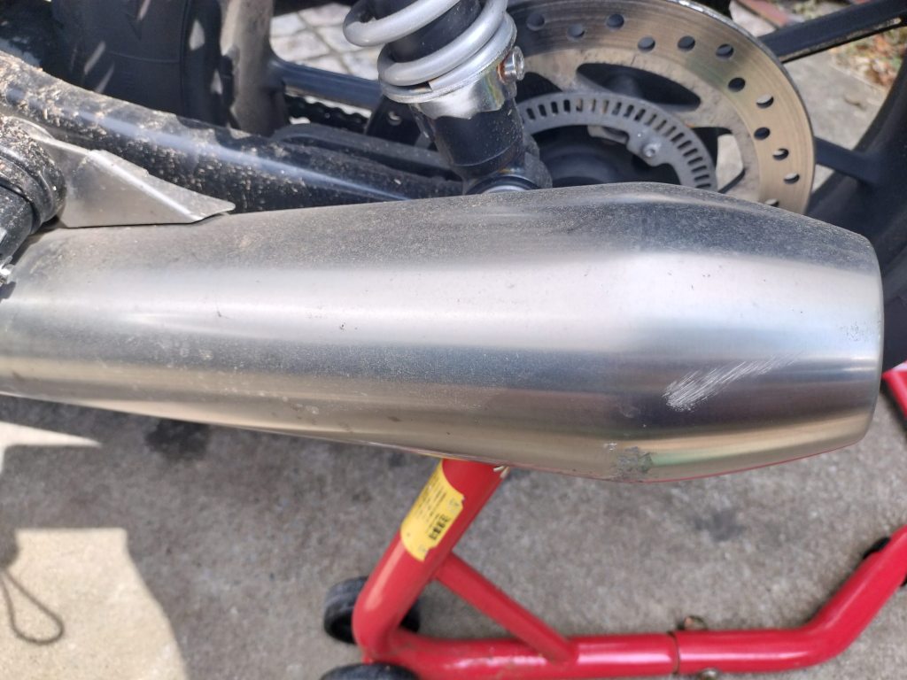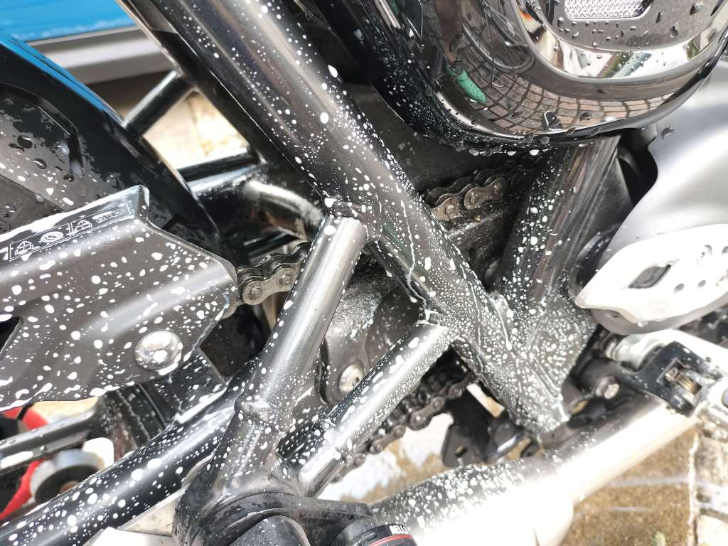 まずは水を流しながら手で大きなドロ汚れを落としました。タンクとかはほとんど汚れていないのですが、やはりリヤホイールやマフラー付近の汚れは油分が主体なので落ちないですね。