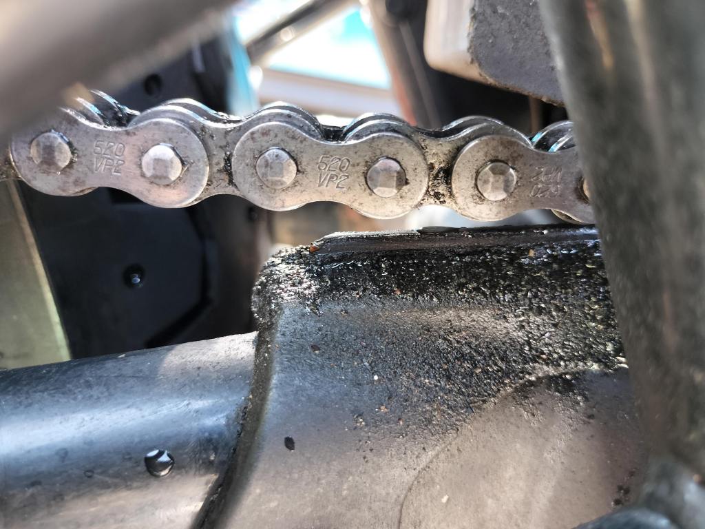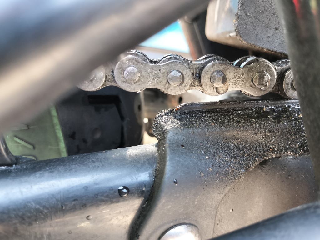チェーンクリーナーを吹付け、ブラシで大きな汚れを軽く掻き出し、ウエスで拭き取ります。チェーンがきれいな状態に戻りました。
