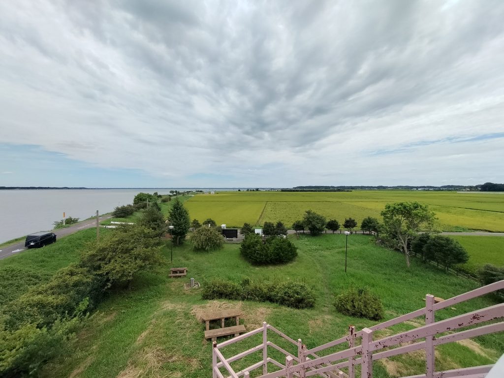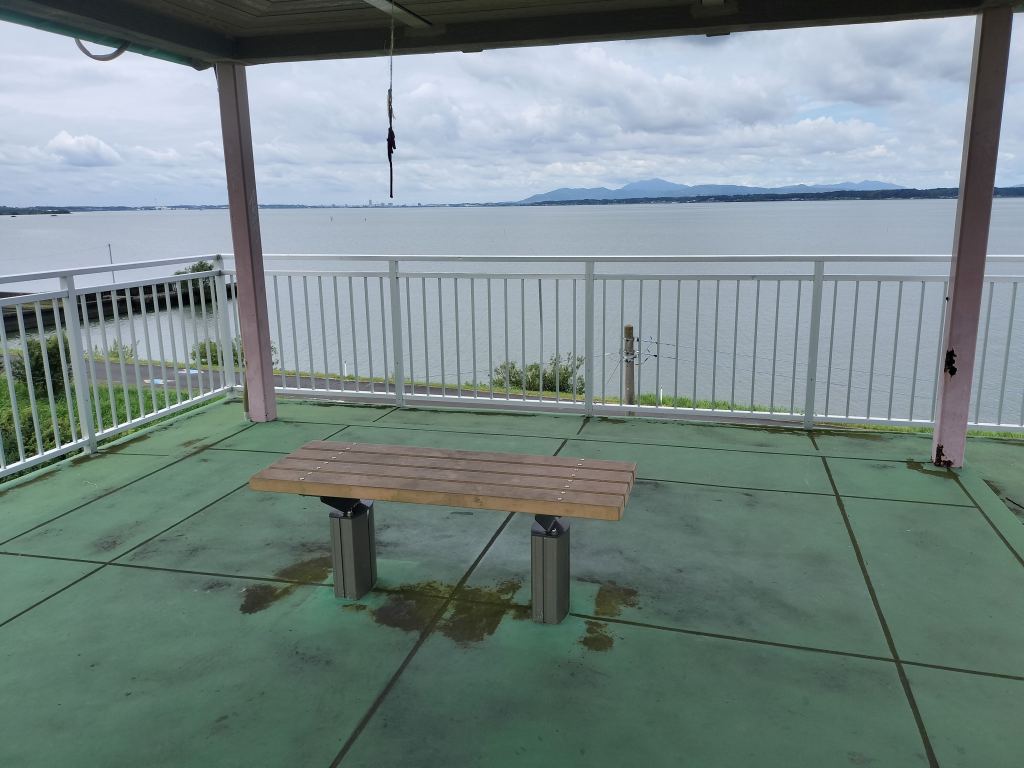 霞ヶ浦を反時計回りに移動すると、展望台が見えてきました。Google Mapによると大須賀津農村公園 展望台というそうです。駐車場には気づかなかったので、道沿いに駐車し、展望台へ向かいました。
