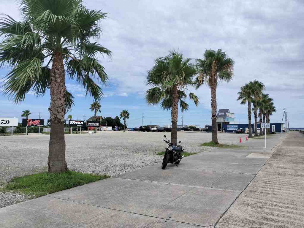 Webを見ると、音楽イベントや自動車のイベントも行われるようです。この日はなにもなかったみたいです。次は、バイクか自動車のイベントの日に来てみたいです。こういったヤシの木のある場所は千葉県にもあるようなので、時間ができたらStreet Twinと記念撮影に行ってみたいです。