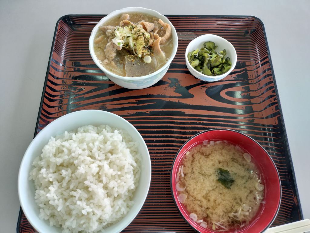 食堂ではもつ定食を頂きました。もつがたくさん入っていて、とても美味しかったです。辛い味付けにするための調味料が置かれているので、自分好みにすることができます。とても美味しかったので、また食べに来ようと思います。