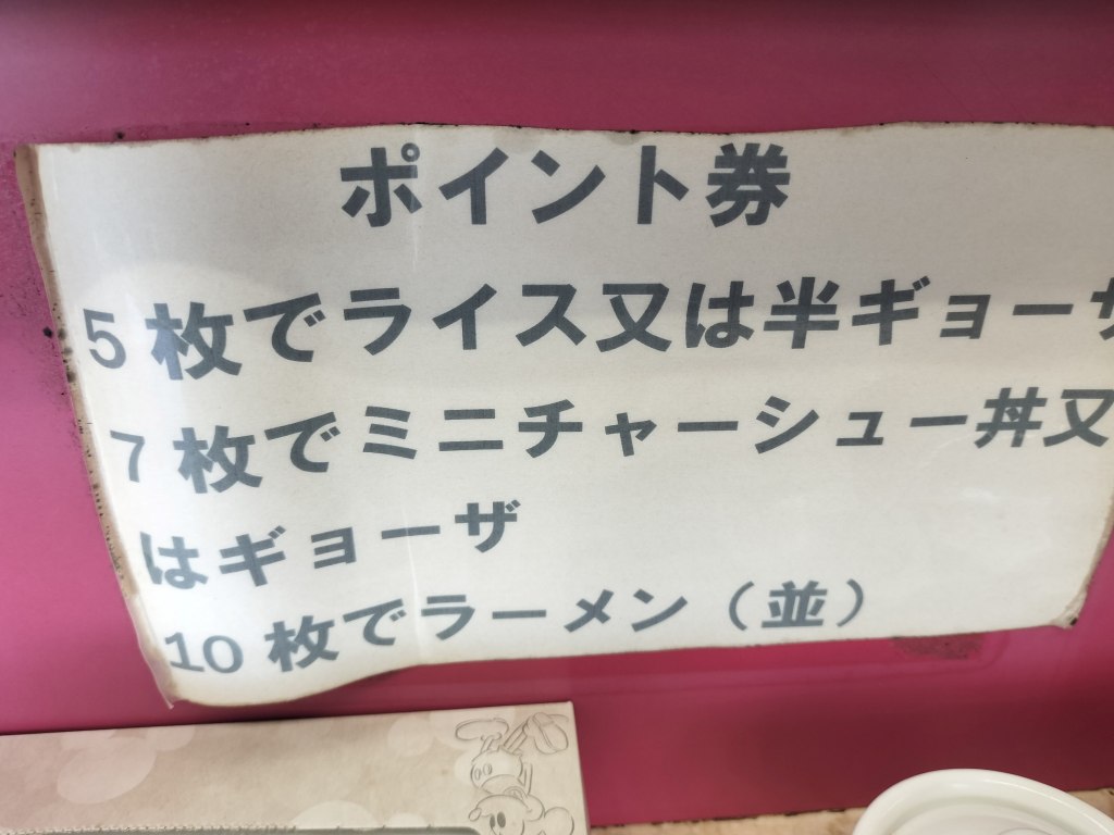正確な名前を失念しましたが、ネギラーメンを注文したと思います。ラーメンを食べてみると、人気があるだけあって、とても美味しかったです。リピートしたくなります。ラーメンを注文すると、ポイント券がもらえます。ポイント券を集めると、ライスや半ギョーザなどがもらえるようです。これもリピートの理由かもしれませんね。