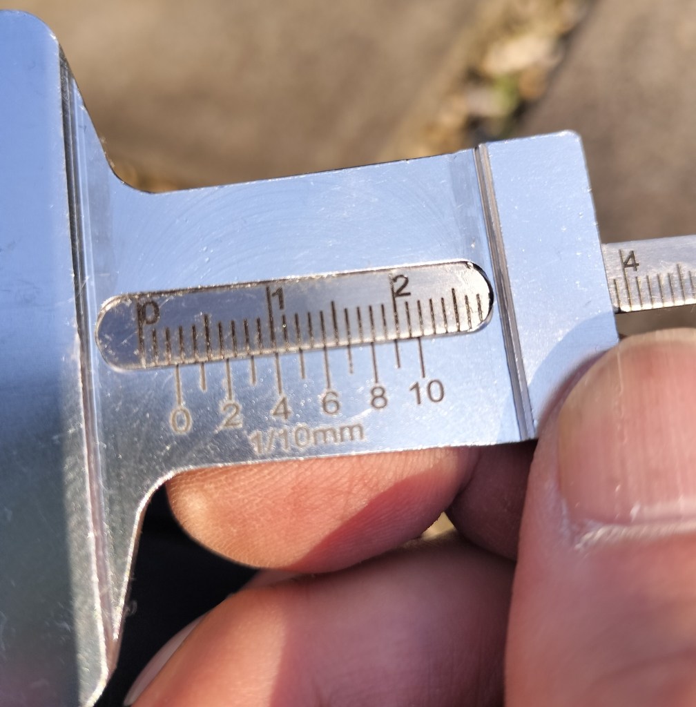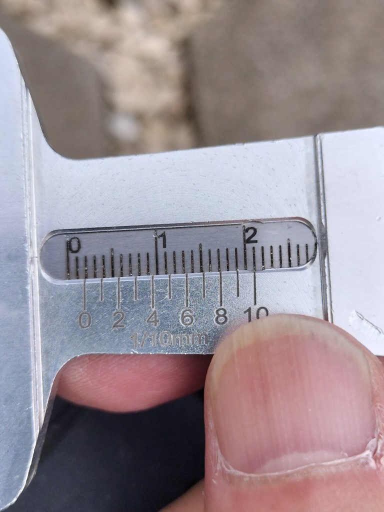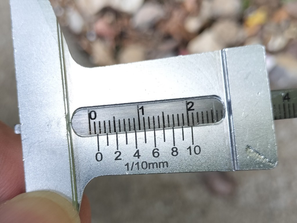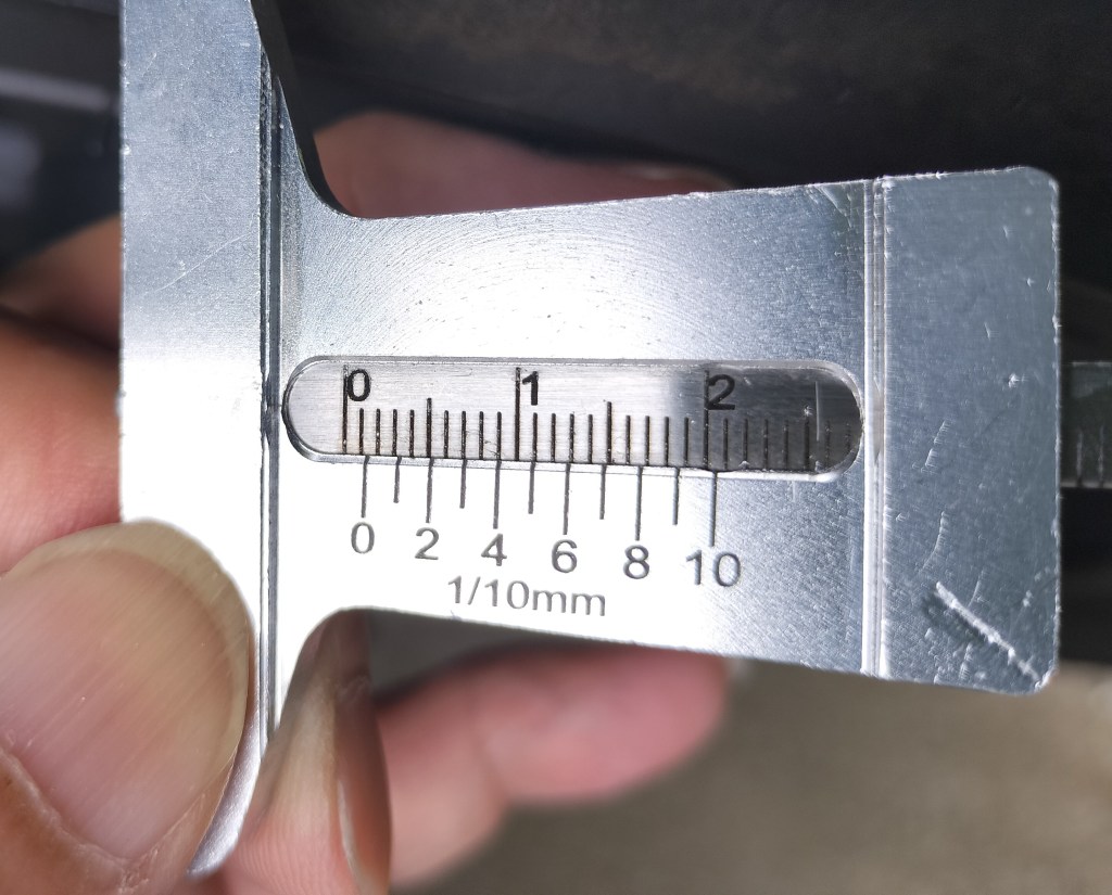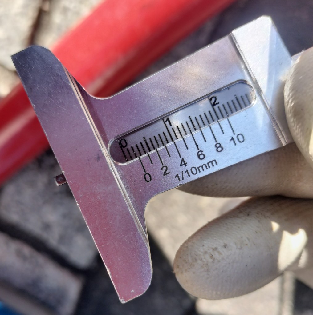 上の画像はODOMETERが13,000㎞を超えたときのものです。つまり、13,000㎞を走行したことになります。3ヵ所計測し、2.9㎜、2.9㎜、2.9㎜でした。今回は上手に測ることができたきがします。スリップサインは近いですが、まだまだ大丈夫そうです。