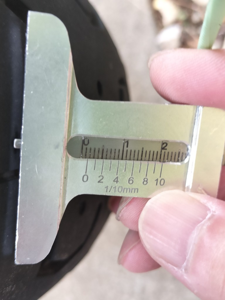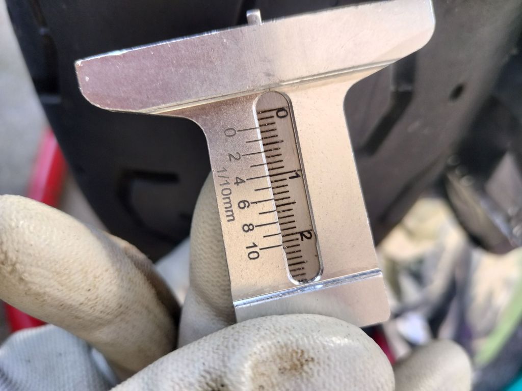 ODOMETERが19,000㎞を超えたときに3ヵ所計測しました。1.1㎜、1.5㎜、1.5㎜でした。何回か測定したのですが、下手だったのか、前回より深い場所も出てしまいました。ただ、スリップサインが地面に設置しているので、目視では明らかに溝が減っているように確認できます。