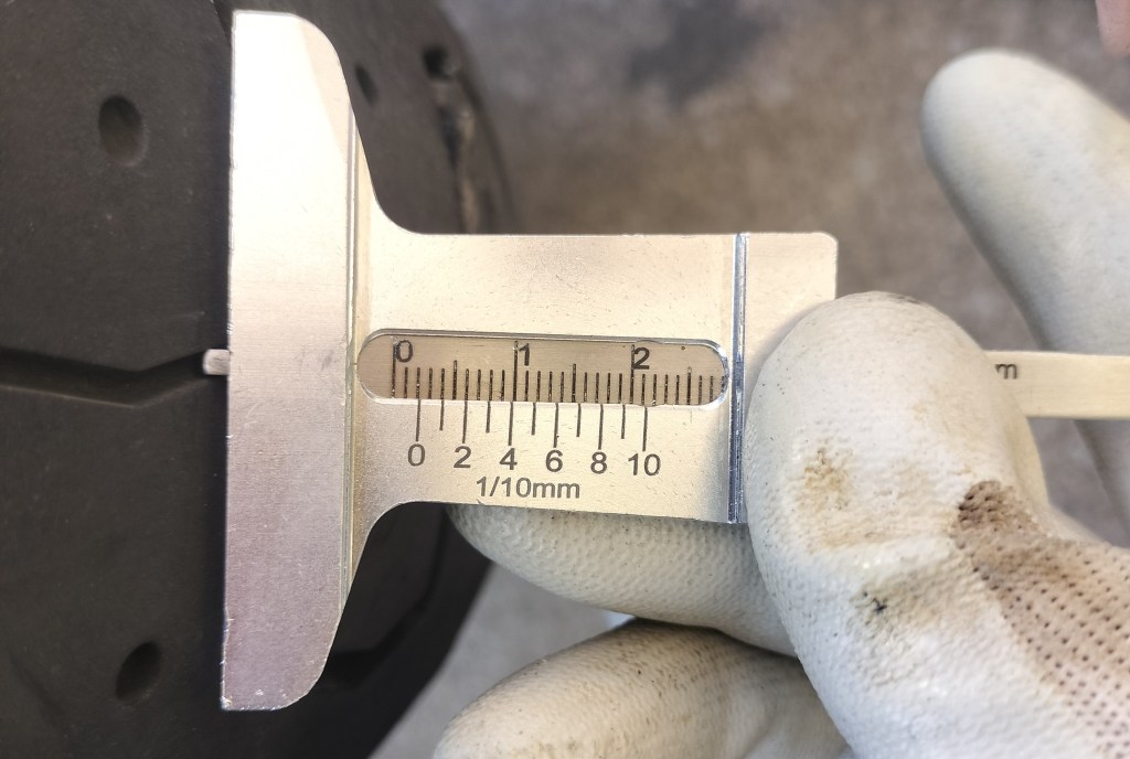 ODOMETERが17,000㎞を超えたときに3ヵ所計測しました。1.4㎜、1.6㎜、1.1㎜でした。確実に摩耗は進んでいます。スリップサインは地面に接していないようです。