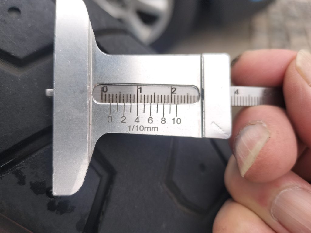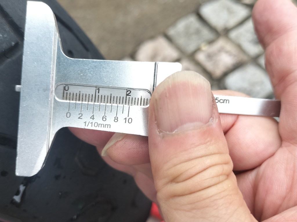 上の画像はODOMETERが10,500㎞くらい、フロントタイヤを交換してから400㎞ほど走った時の計測値です。3ヵ所ほど計測しました。それぞれ、3.6㎜、3.6㎜、3.4㎜でした。まだ摩耗というより、「皮むき」が終わった感じでした。