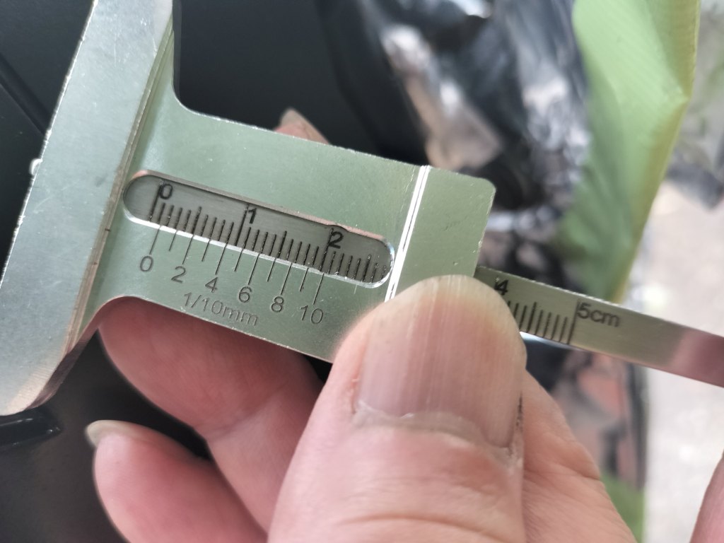 上の画像はODOMETERが11,000㎞くらい、交換から約900㎞走ったあとの計測値です。3ヵ所を測定し、3.6㎜、3.0㎜、3.4㎜でした。減ったと言えば減った感じがしますが、まだ誤差の範囲のようでした。