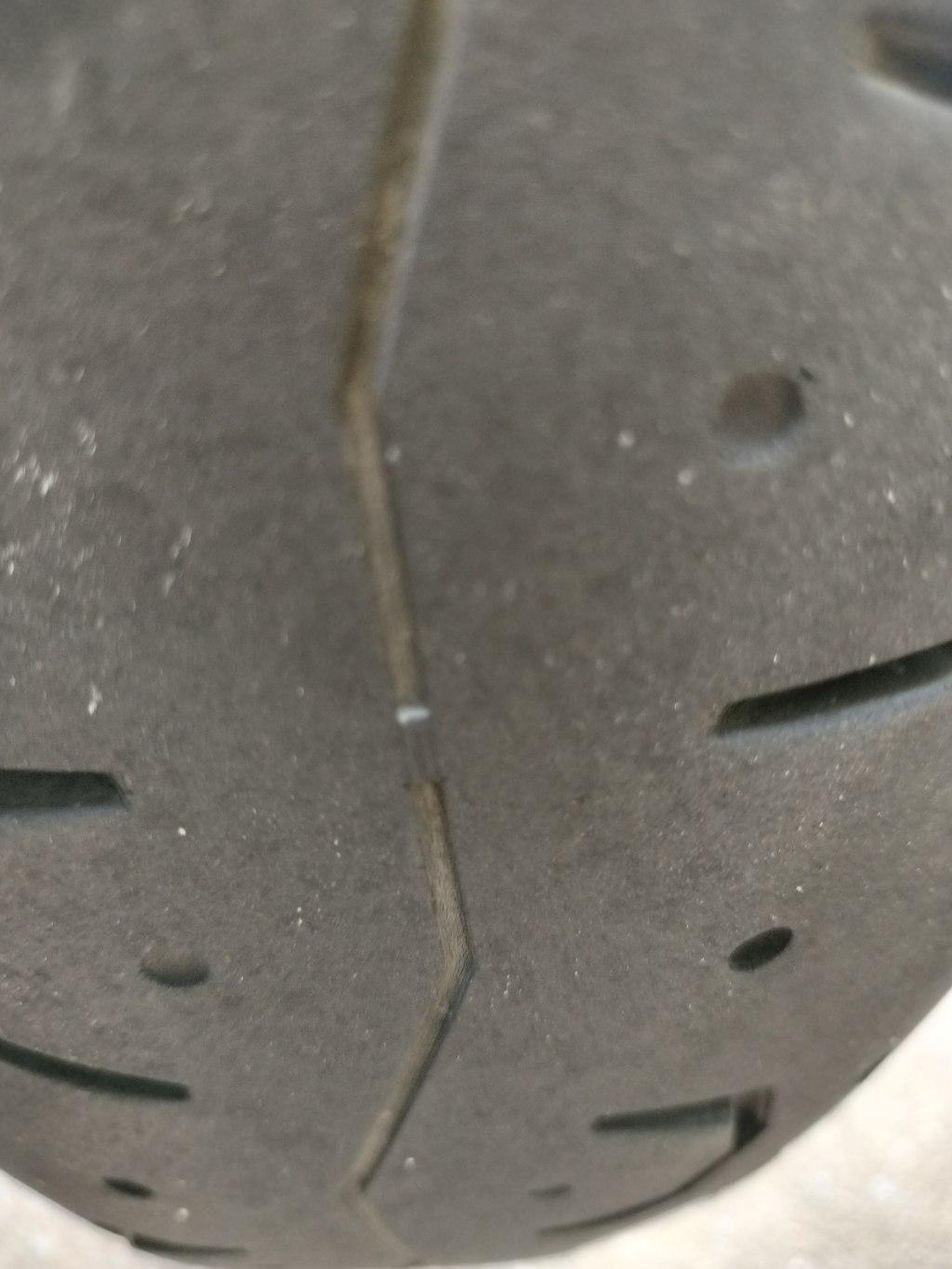 上の画像は交換後9,000㎞走行の測定値です。3ヵ所測定し、1.9㎜、2.0㎜、1.8㎜でした。計測が下手だったのか、少し足踏み状態のようです。スリップサインが路面に触れ始めたのか、少し角が取れてきた感じがします。でも、まだまだ使えそうです。